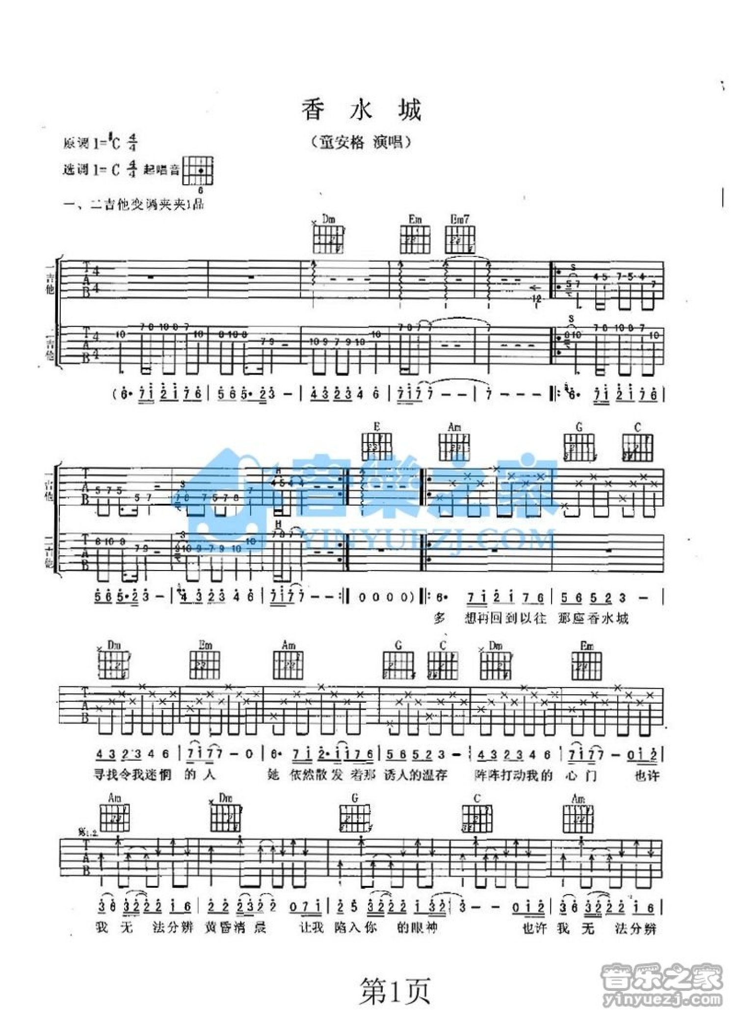 曲谱介绍: C调版《香水城》吉他弹唱六线谱