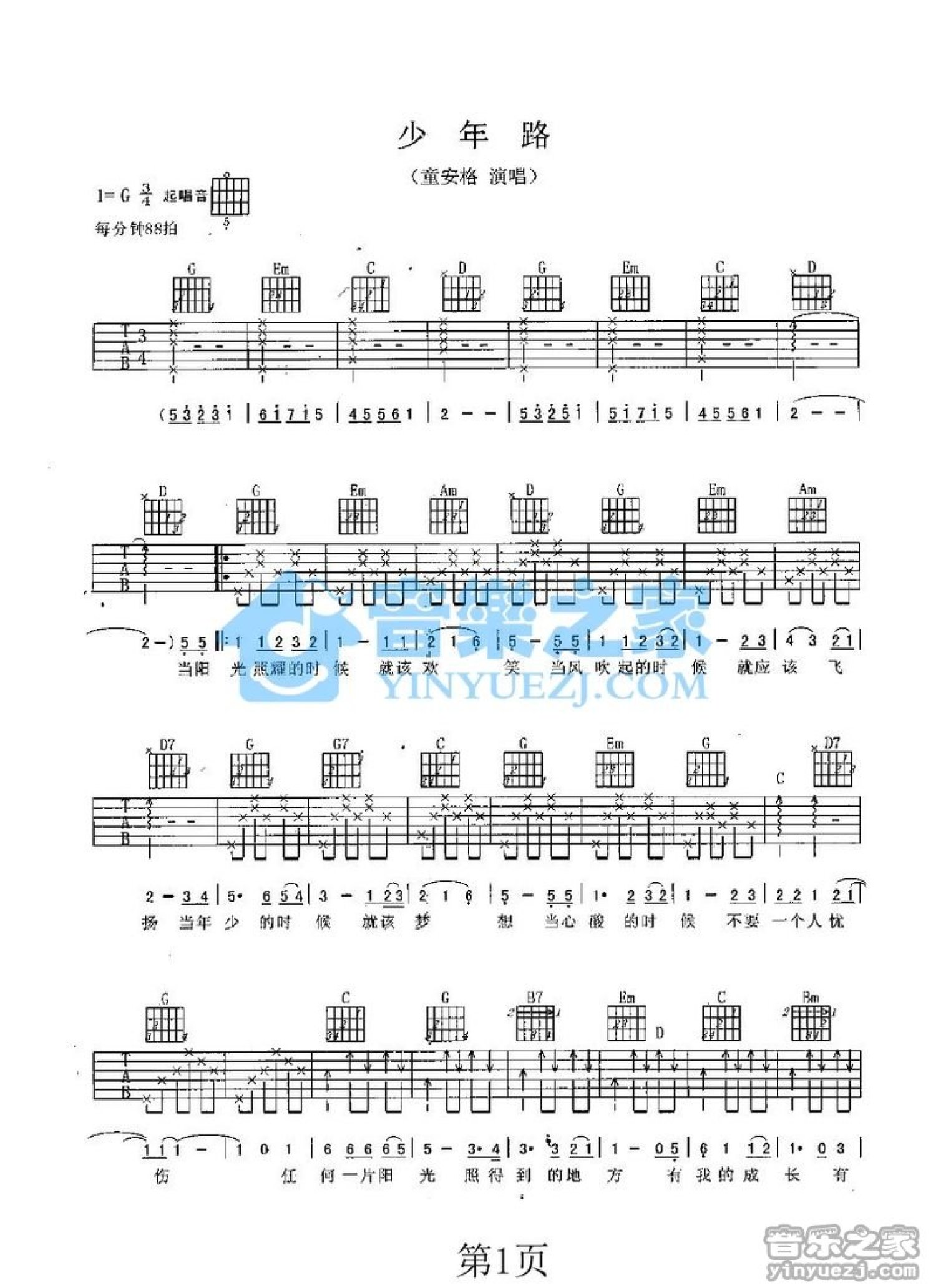 曲谱介绍: G调版《少年路》吉他弹唱六线谱