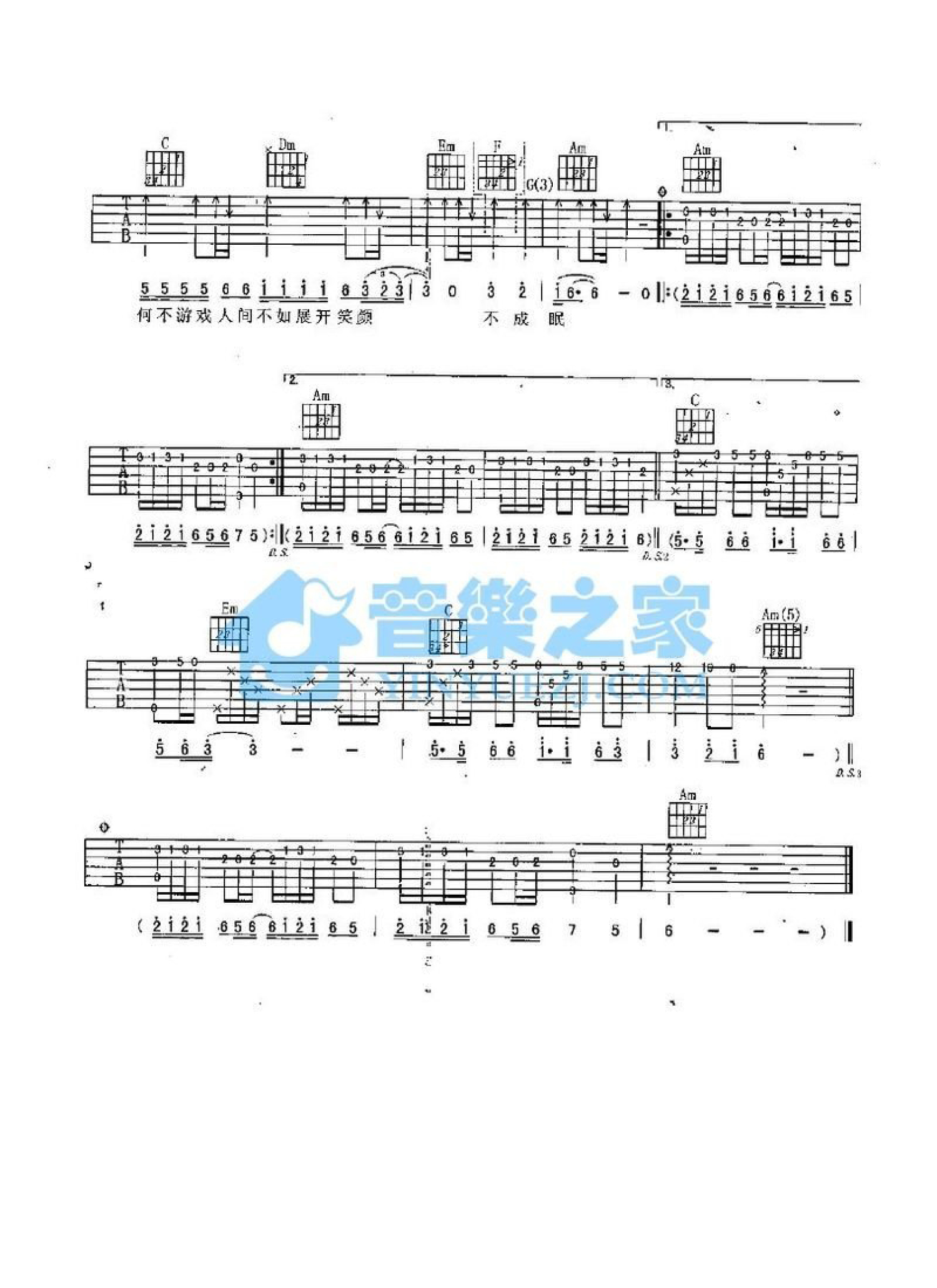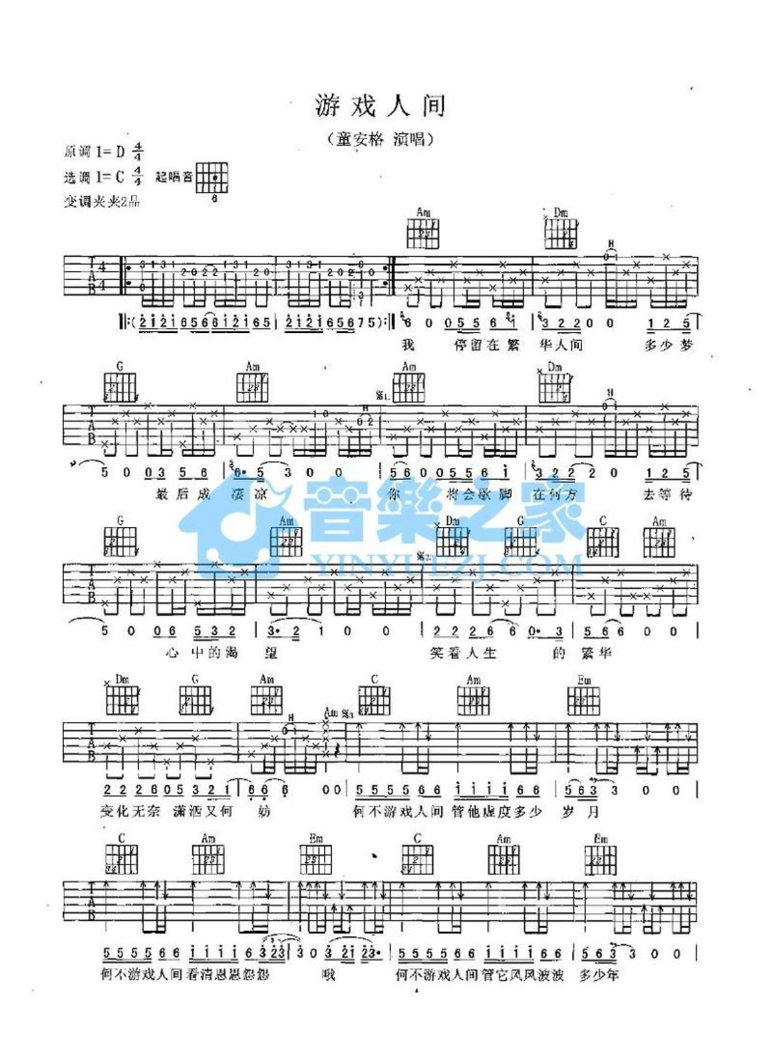 曲谱介绍: C调版童安格《游戏人间》吉他弹唱六线谱