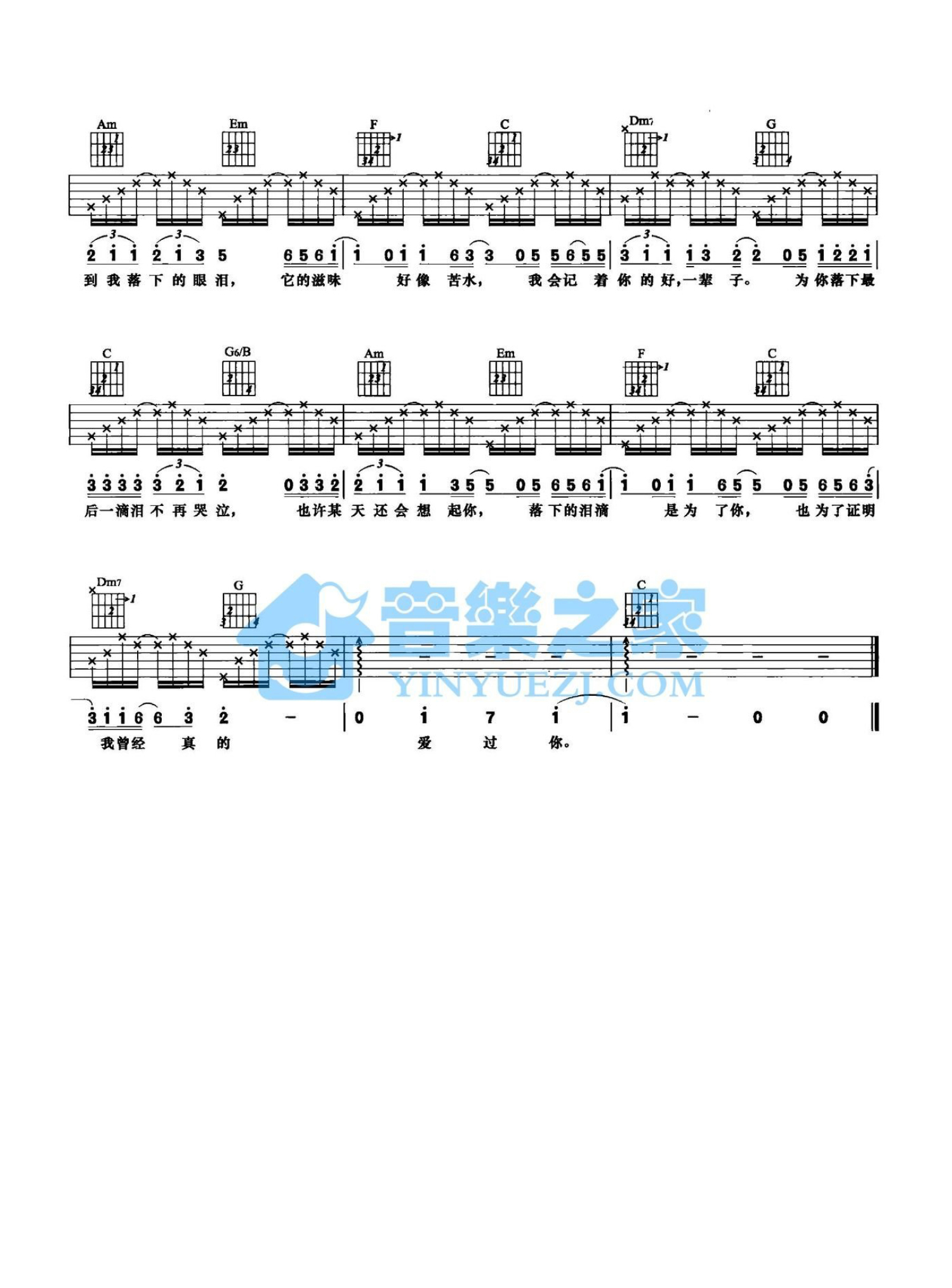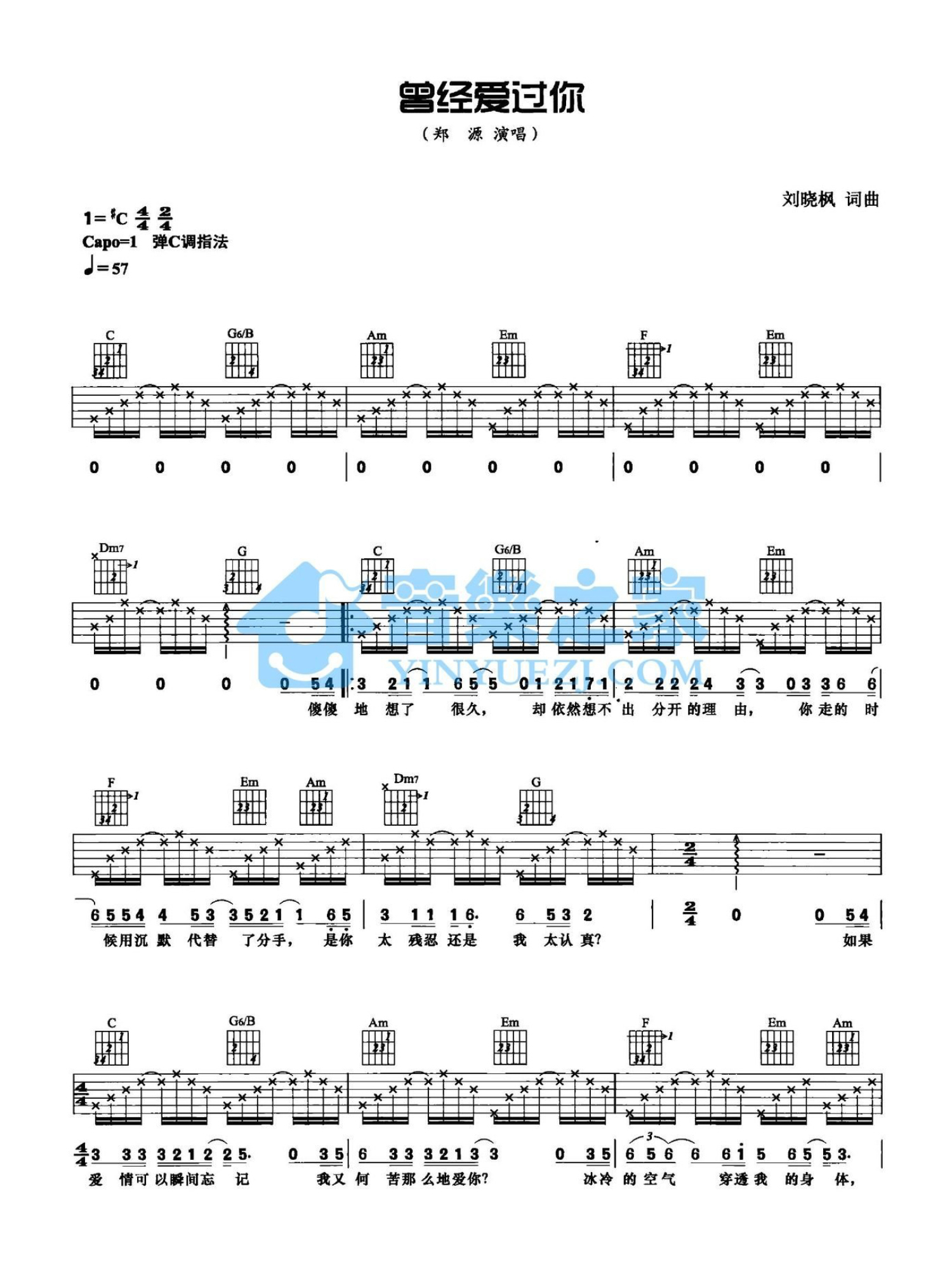 曲谱介绍: C调版 郑源《曾经爱过你》吉他弹唱六线谱