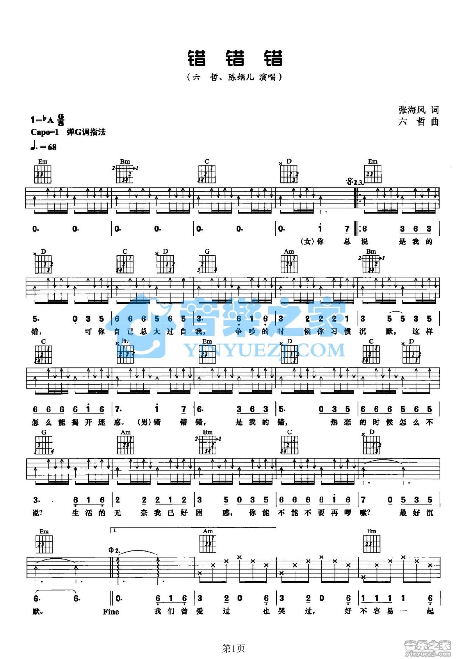 曲谱介绍: G调版六哲/陈娟儿《错错错》吉他弹唱六线谱