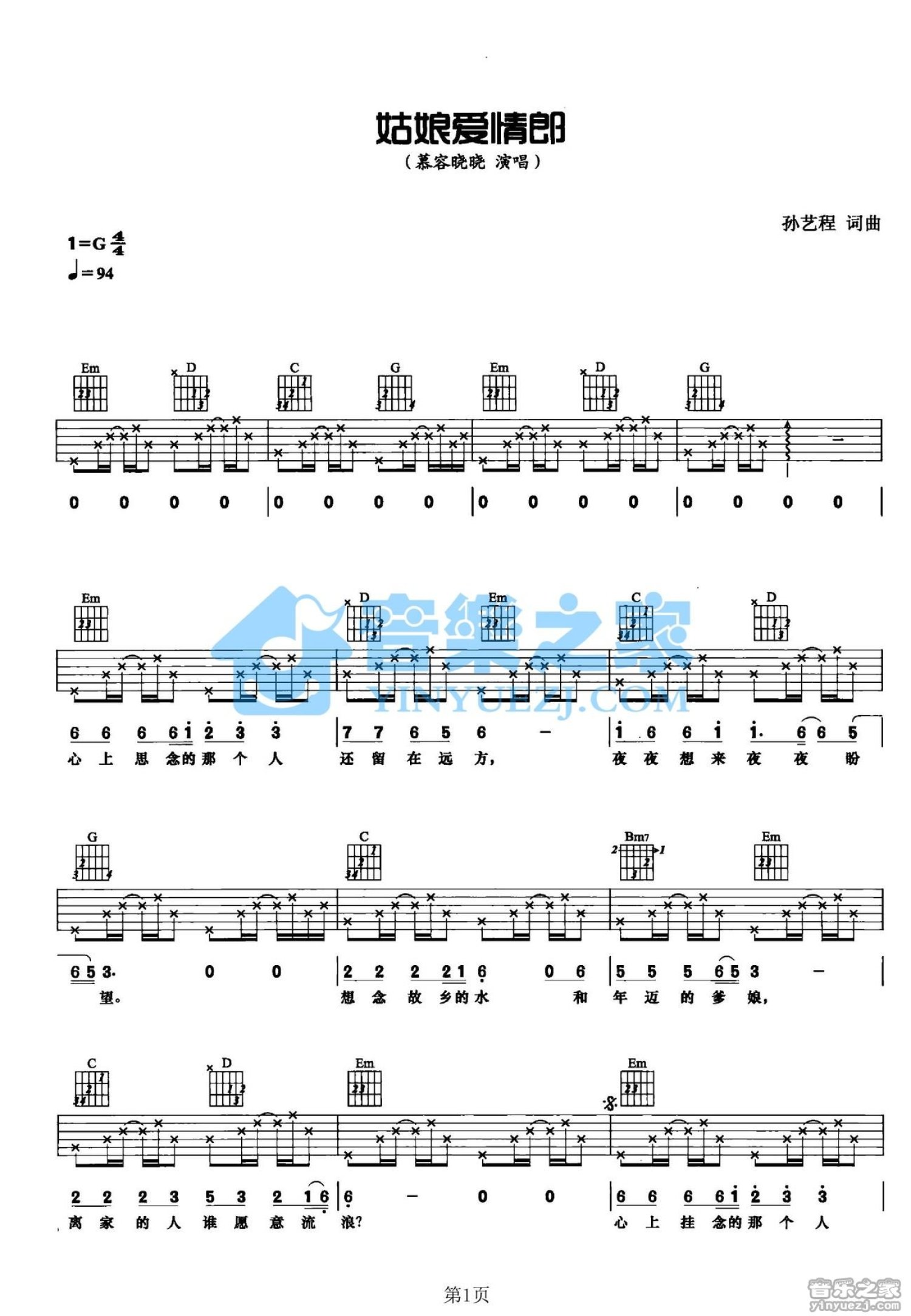 曲谱介绍: G调版慕容晓晓《姑娘爱情郎》吉他弹唱六线谱