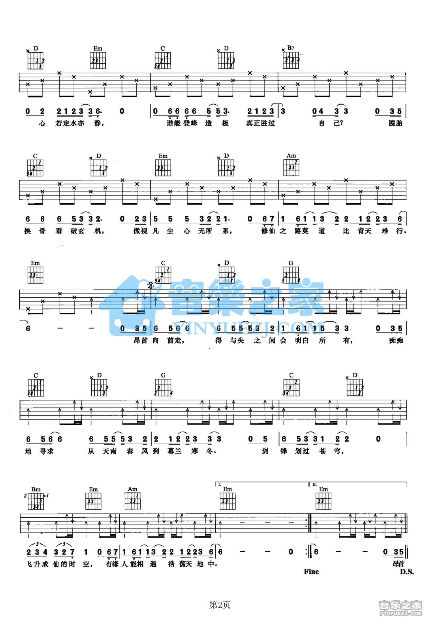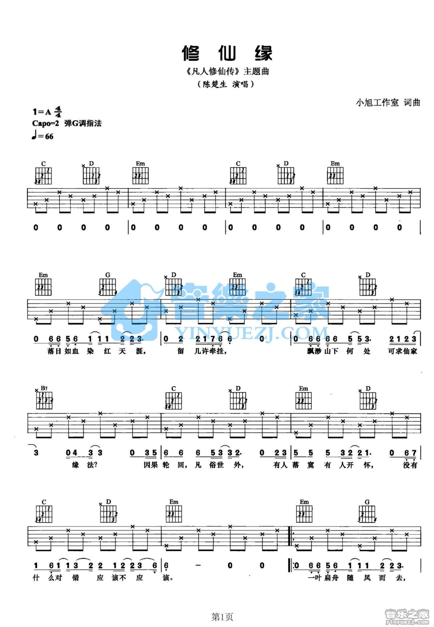 曲谱介绍: G调完整版陈楚生《修仙缘》吉他弹唱六线谱