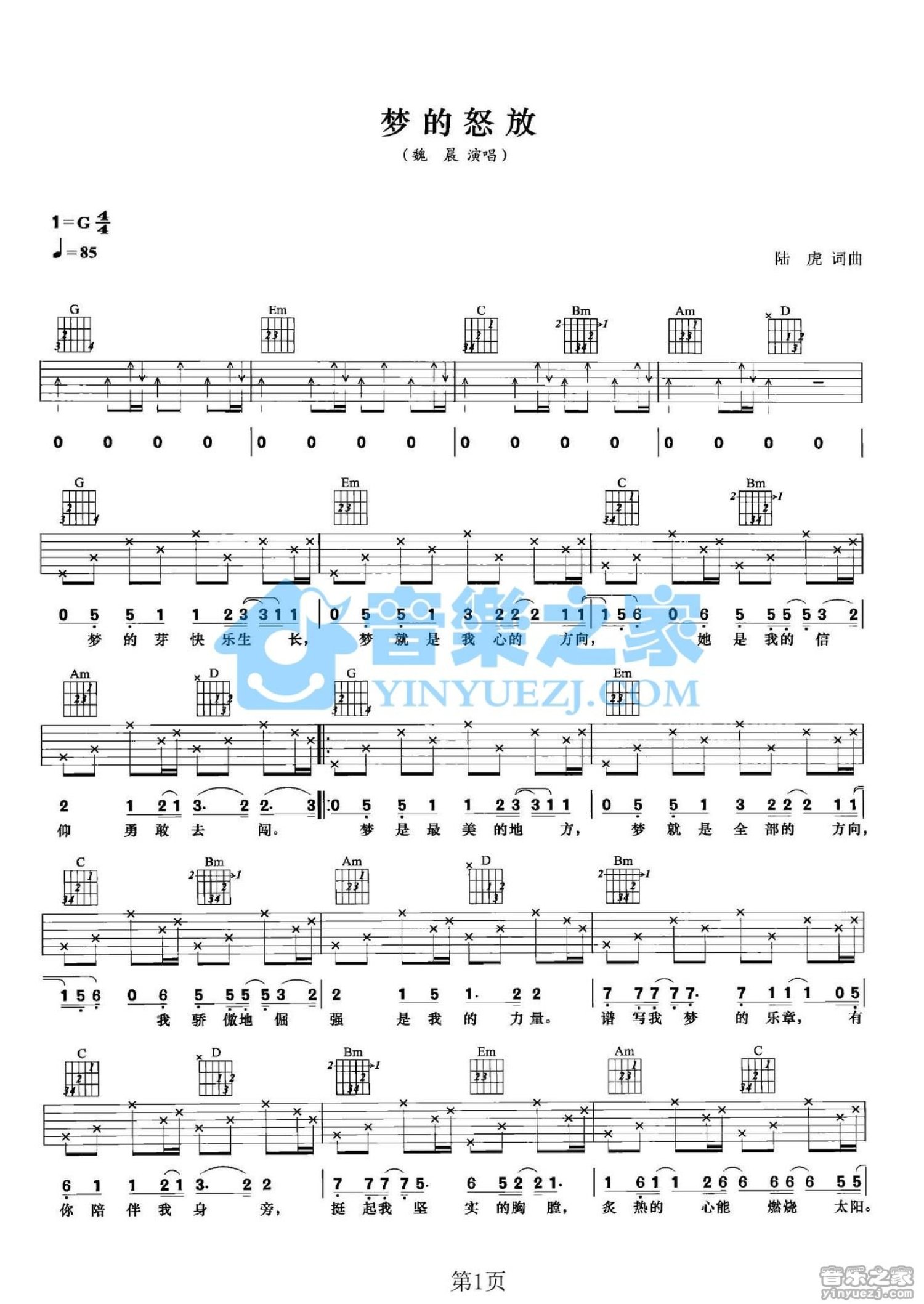 曲谱介绍: G调版魏晨《梦的怒放》吉他弹唱六线谱