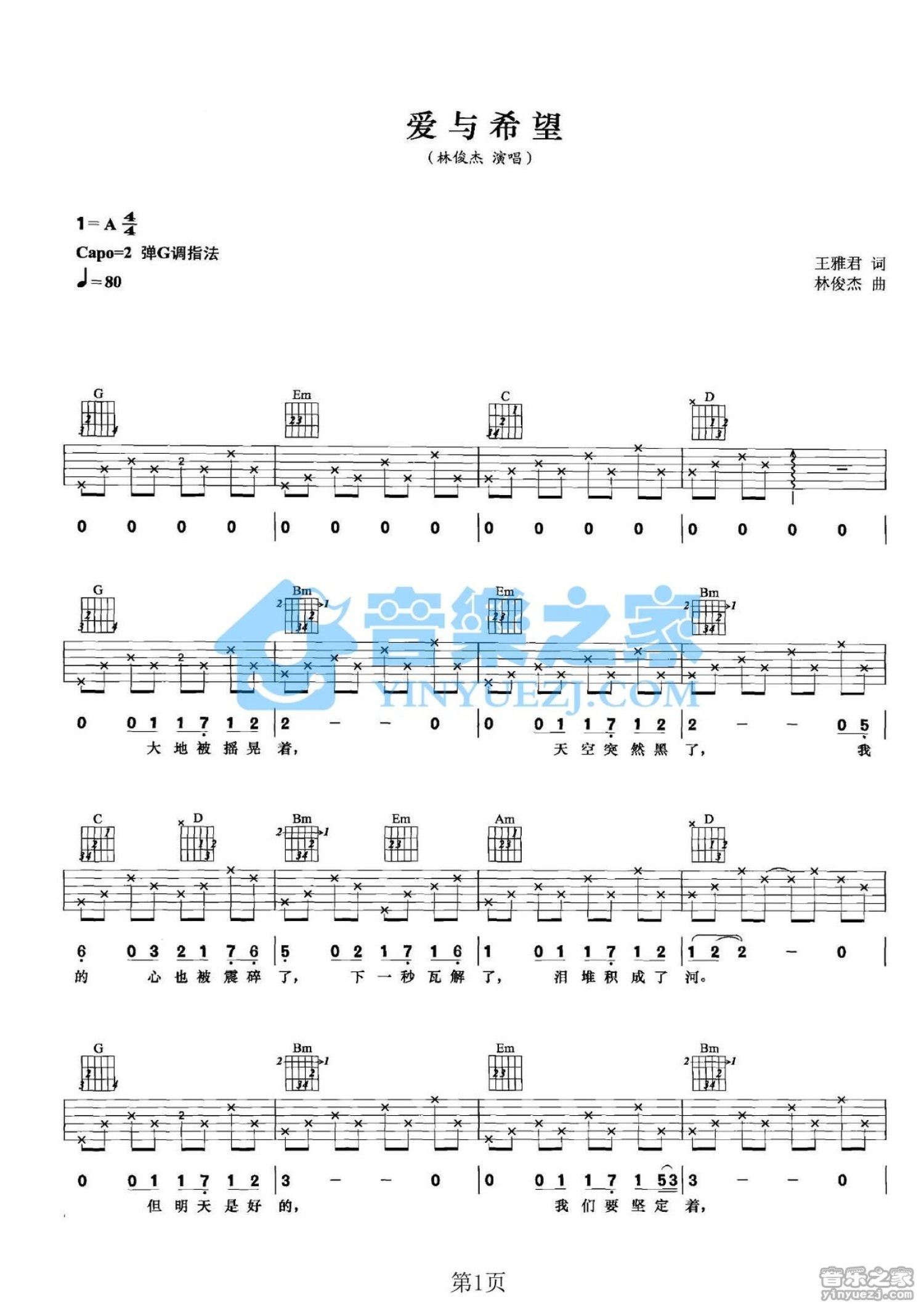 曲谱介绍: G调版林俊杰《爱与希望》吉他弹唱六线谱
