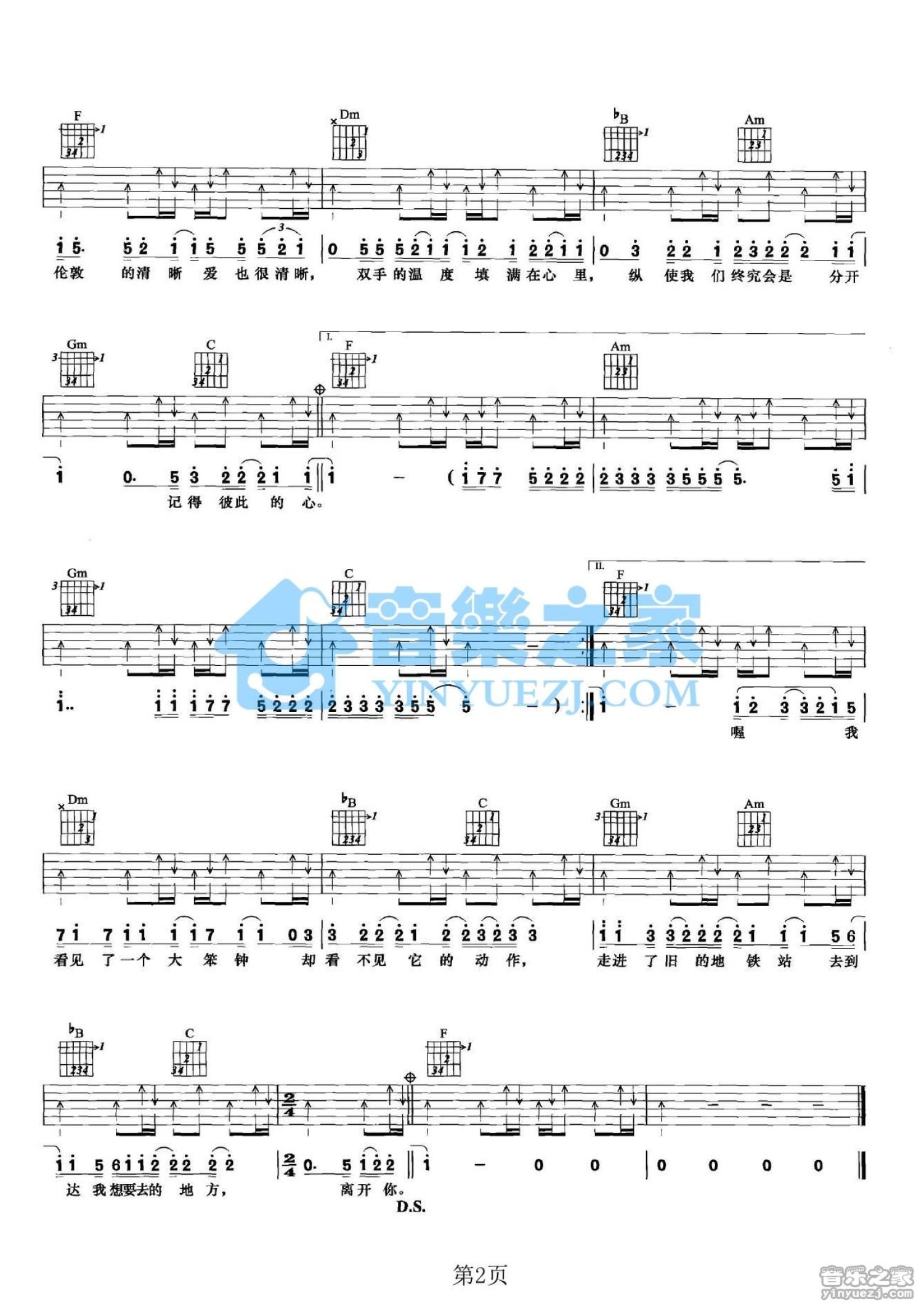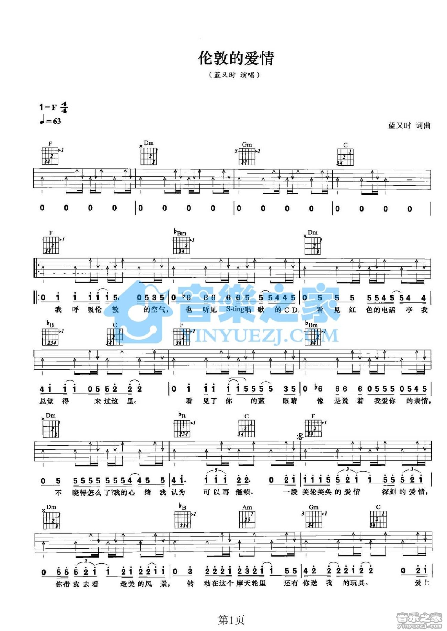 曲谱介绍: F调版蓝又时《伦敦的爱情》吉他弹唱六线谱