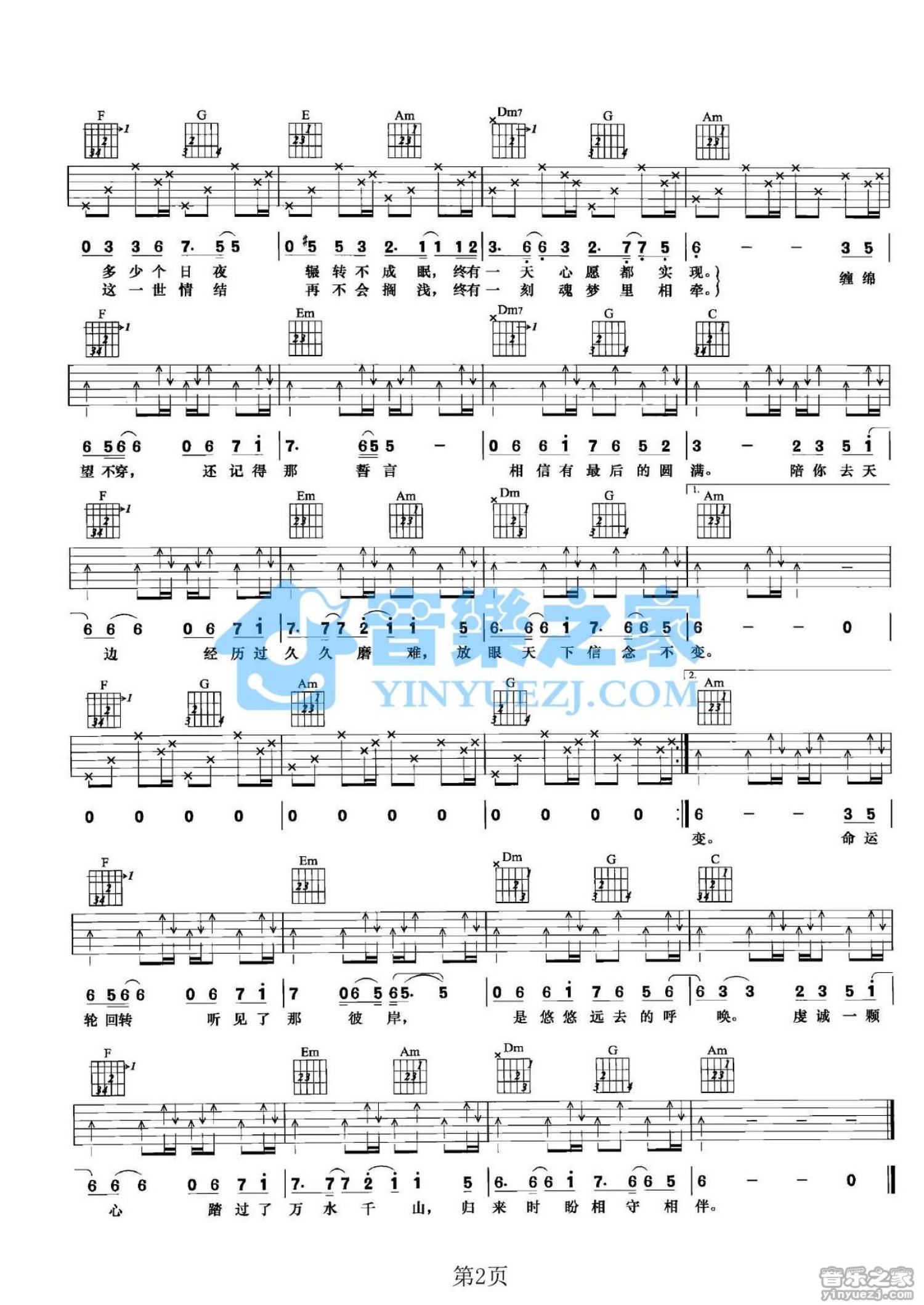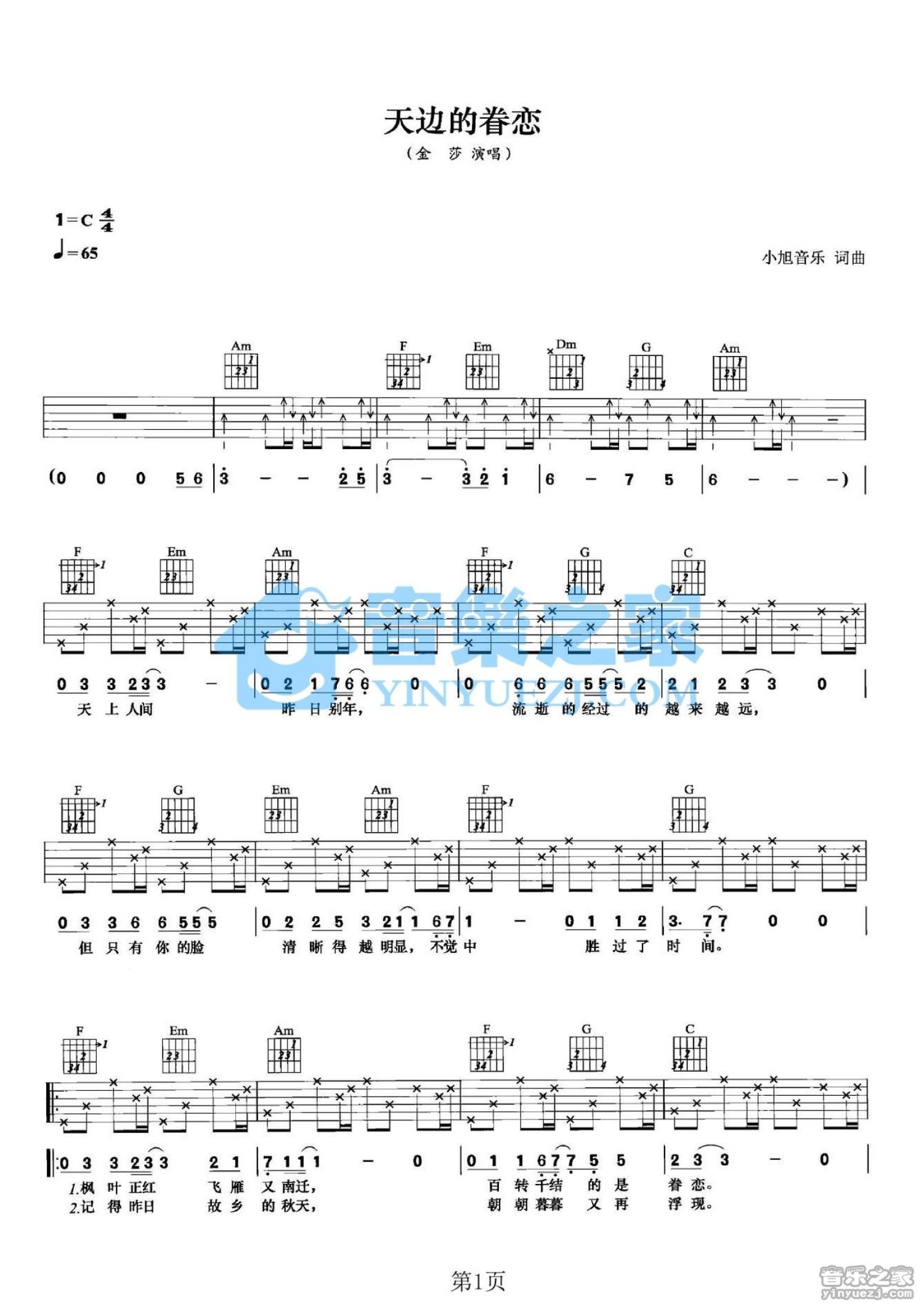 曲谱介绍: C调版金莎《天边的眷恋》吉他弹唱六线谱