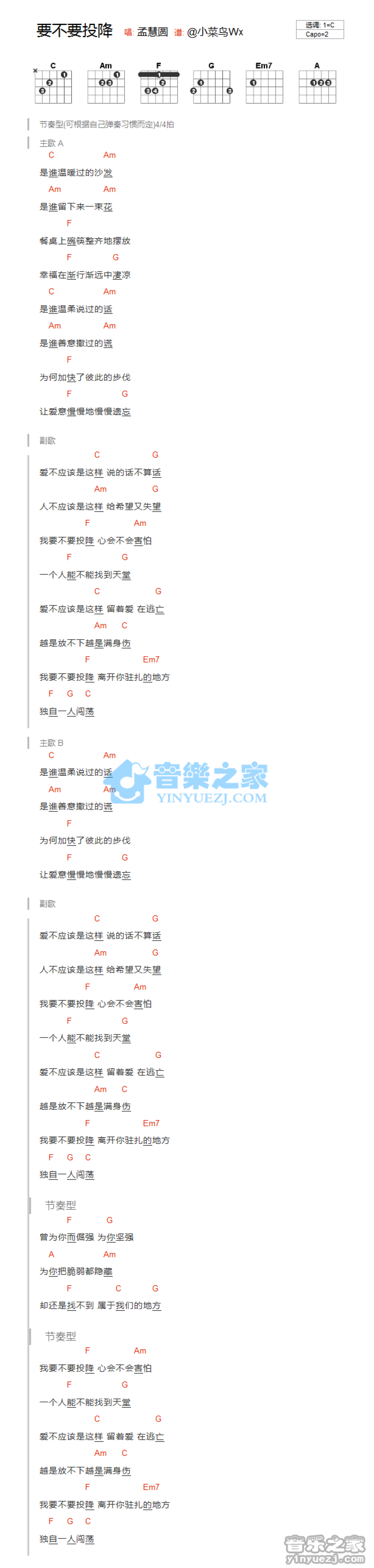 曲谱介绍: C调版孟慧圆《要不要投降》吉他和弦弹唱谱