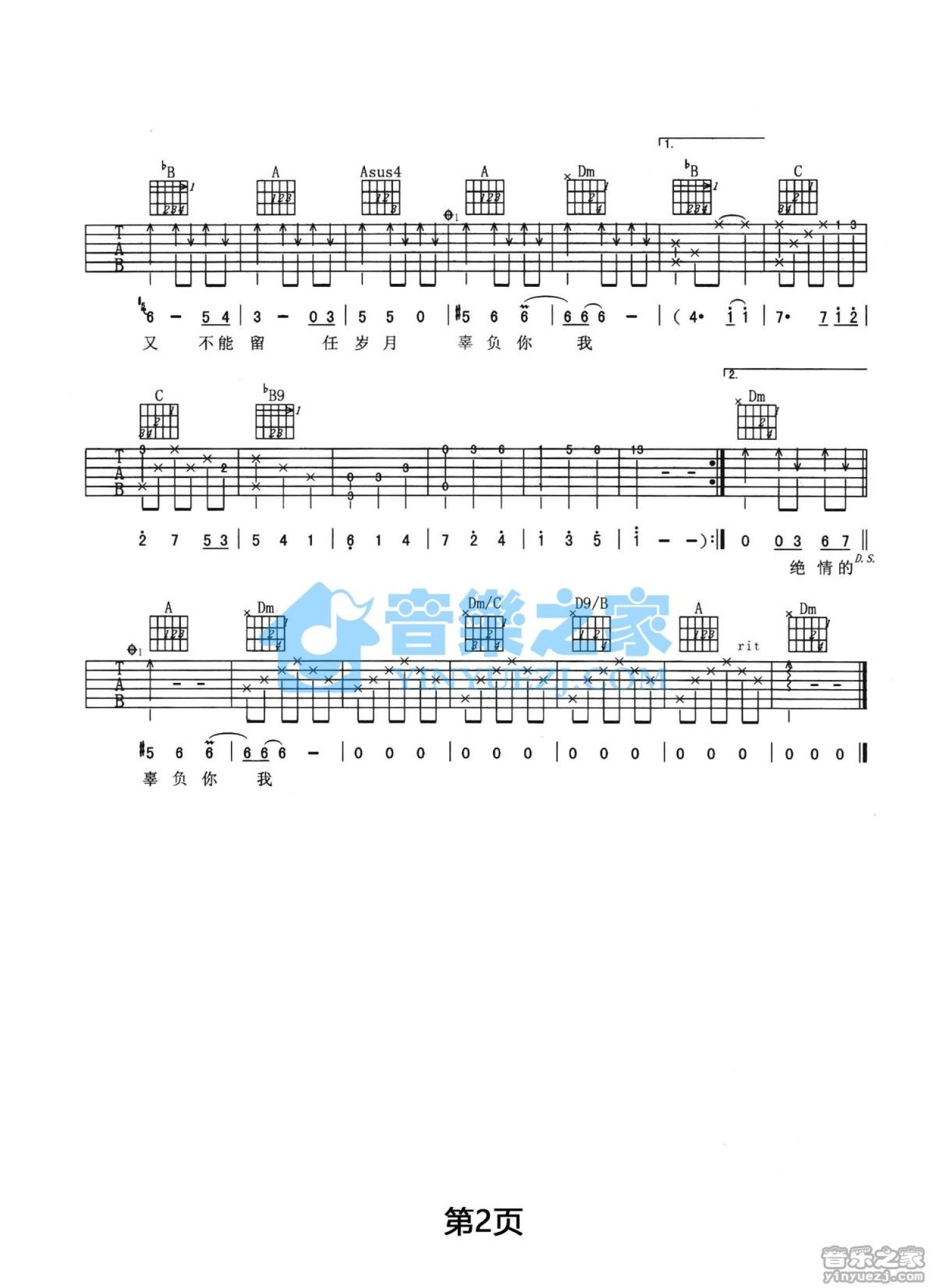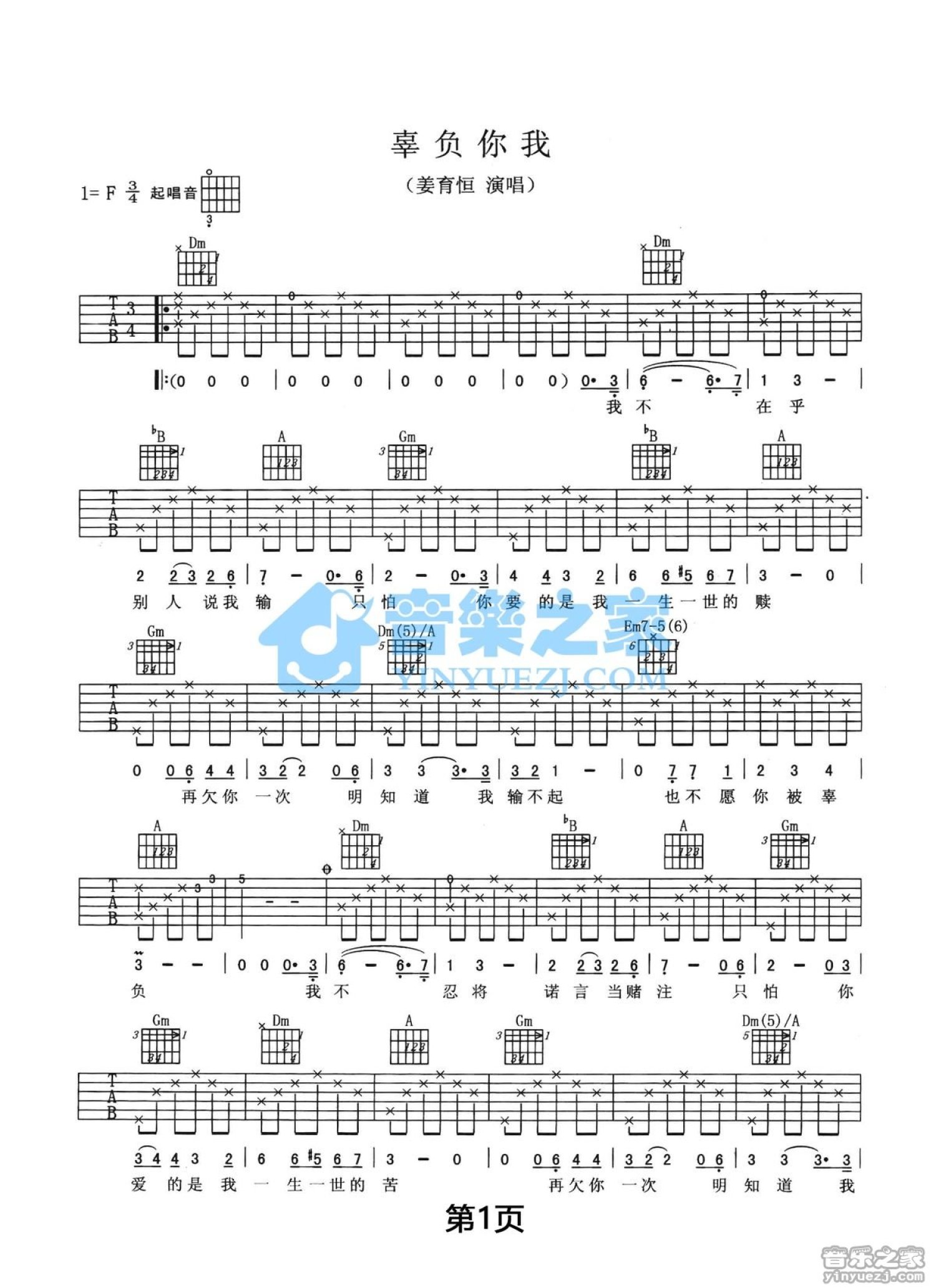 曲谱介绍: F调版姜育恒《辜负你我》吉他弹唱六线谱