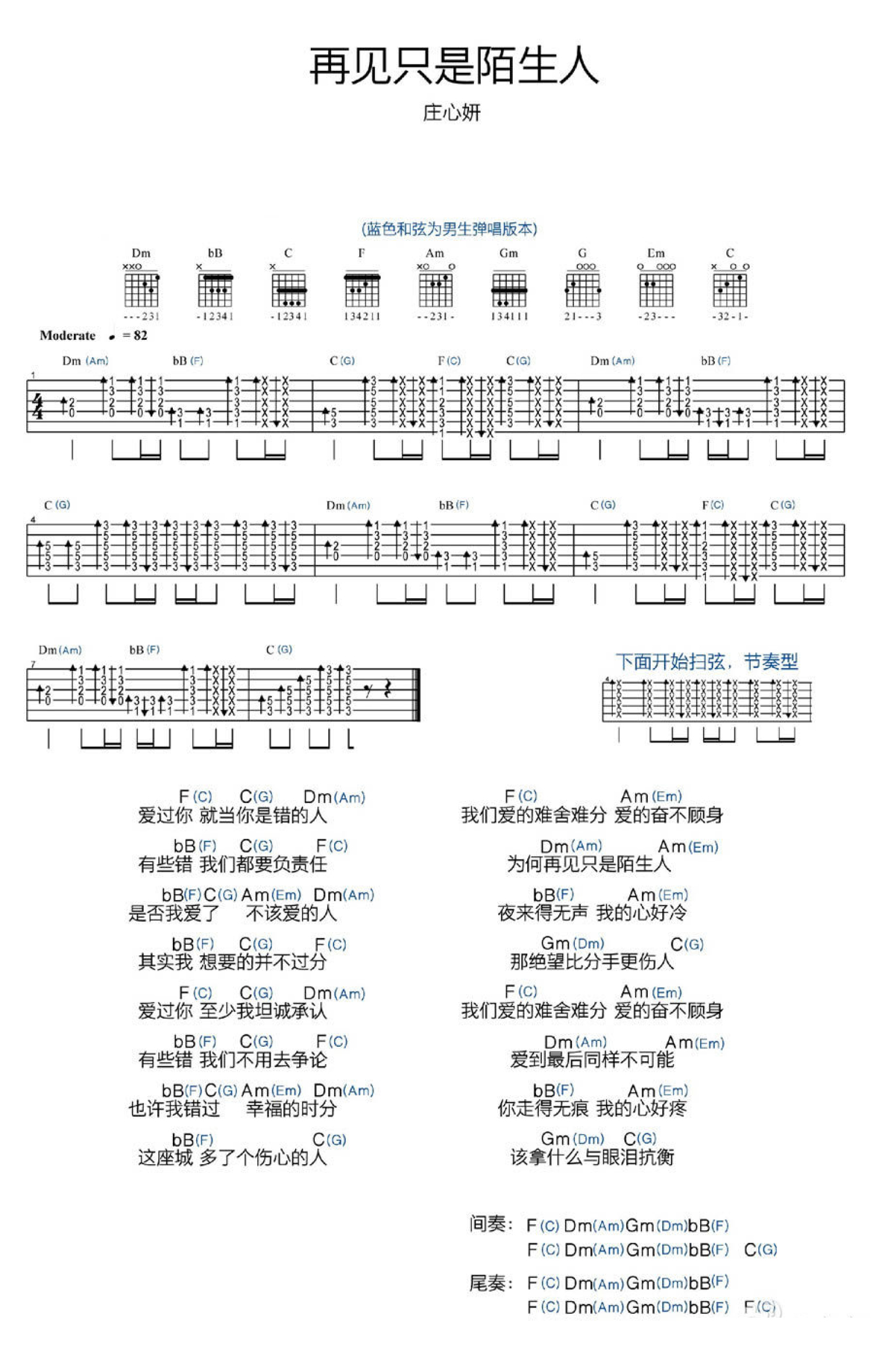 再见只是陌生人吉他谱 - 庄心妍 - 吉他弹唱谱 - 和弦谱