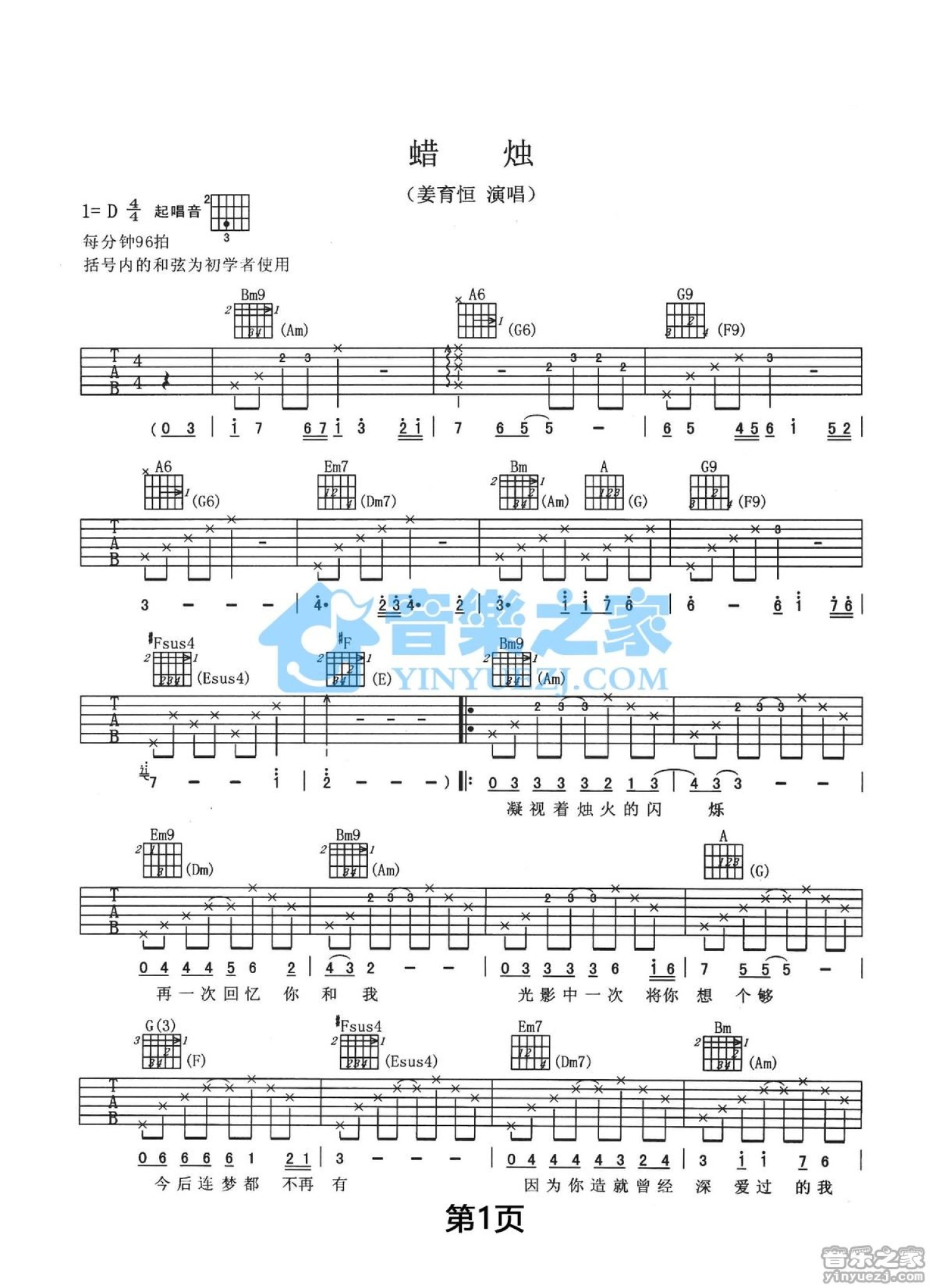 曲谱介绍: D调版 姜育恒《蜡烛》吉他吉他弹唱六线谱