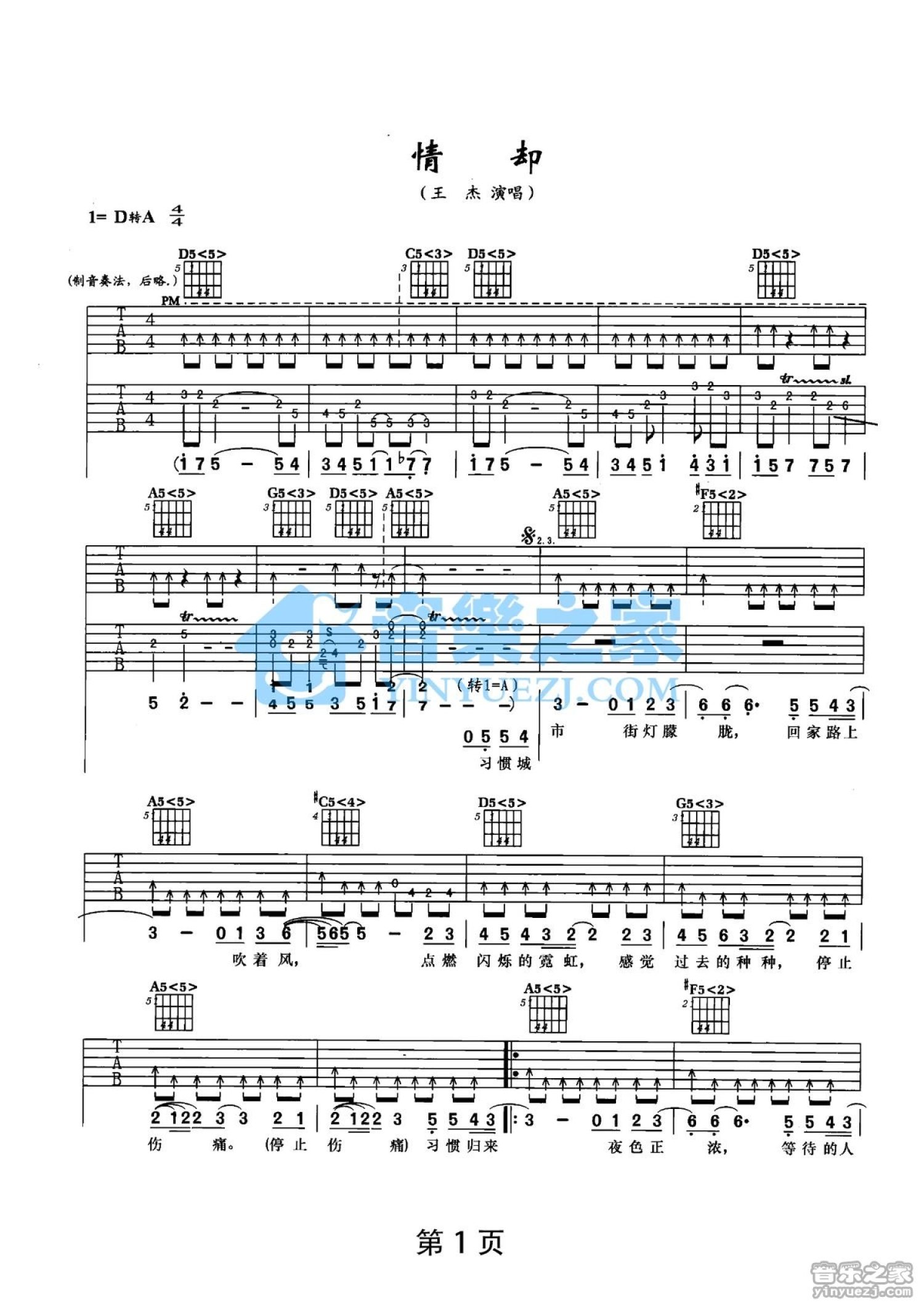 曲谱介绍: D转A调双吉他版王杰《情却》吉他弹唱六线谱