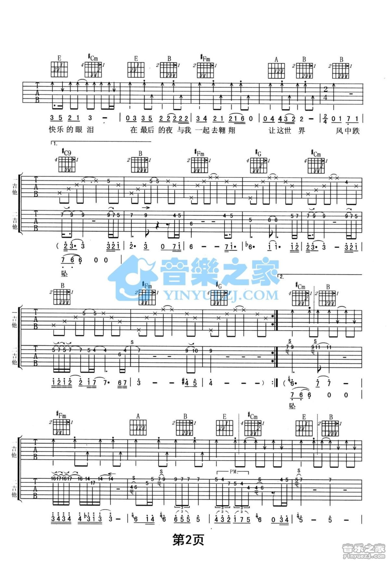 曲谱介绍: E调双吉他版田震《最后的夜》吉他弹唱六线谱