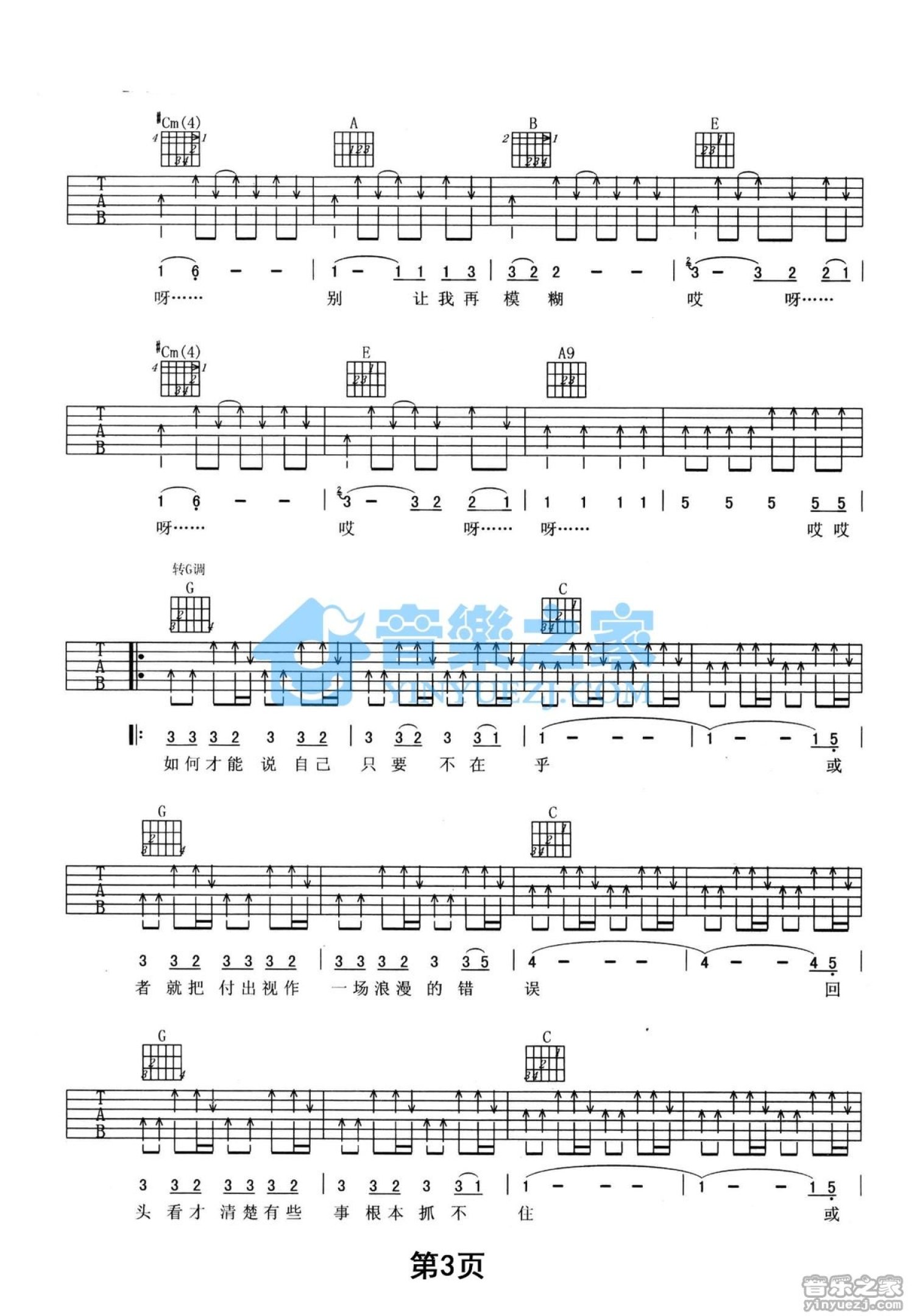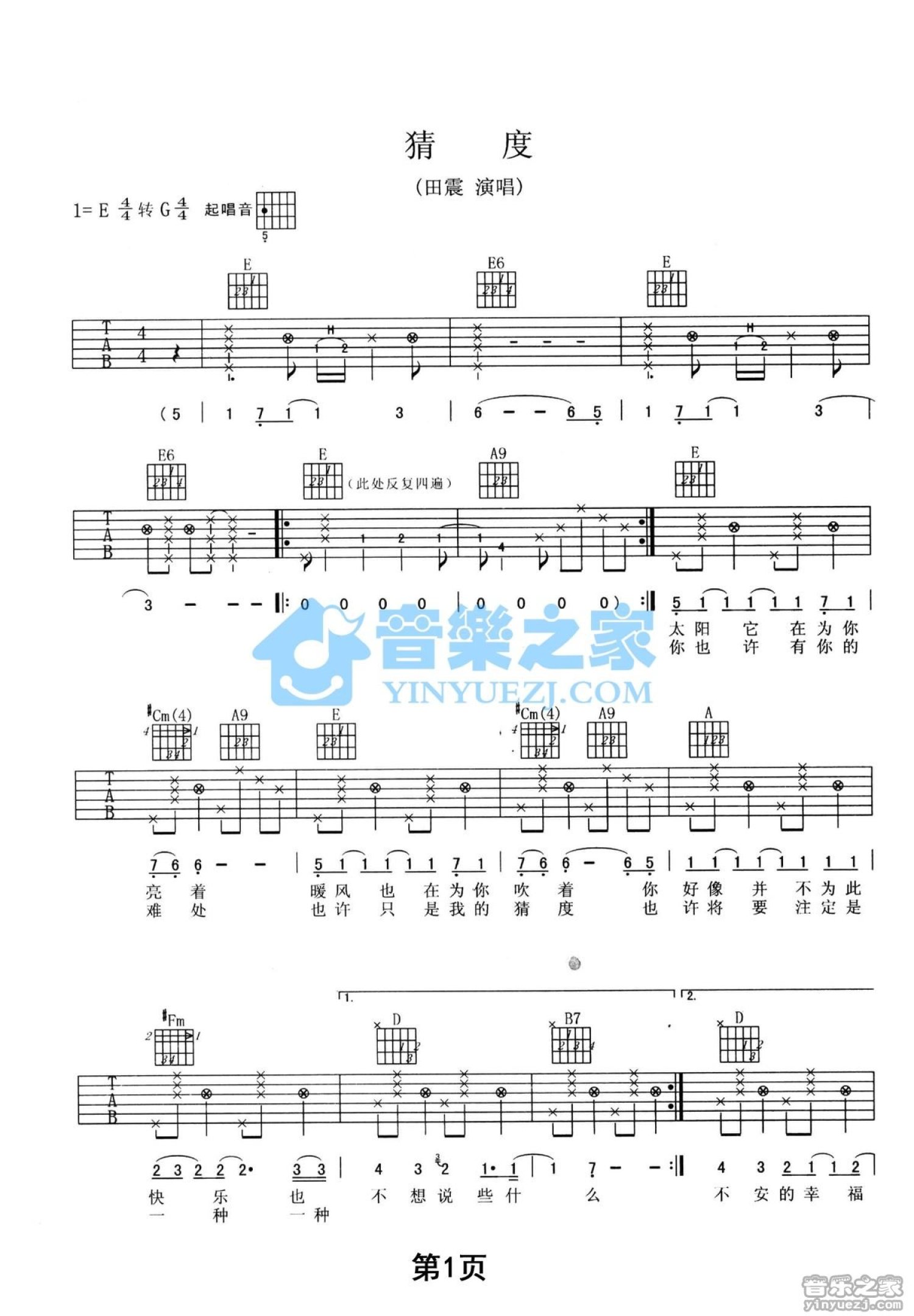 曲谱介绍: E调版 田震《猜度》吉他弹唱六线谱