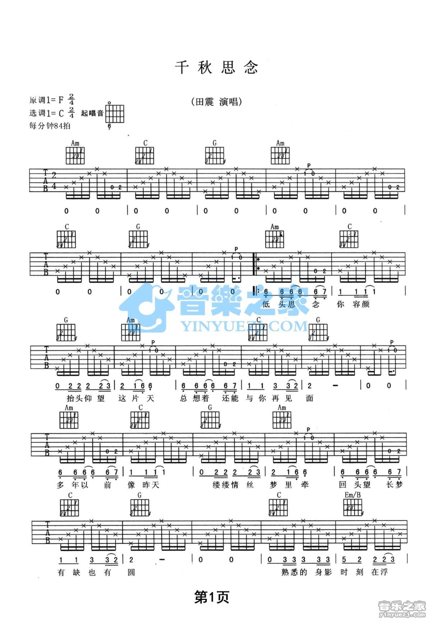 曲谱介绍: C调双吉他版 田震《千秋思念》吉他弹唱六线谱