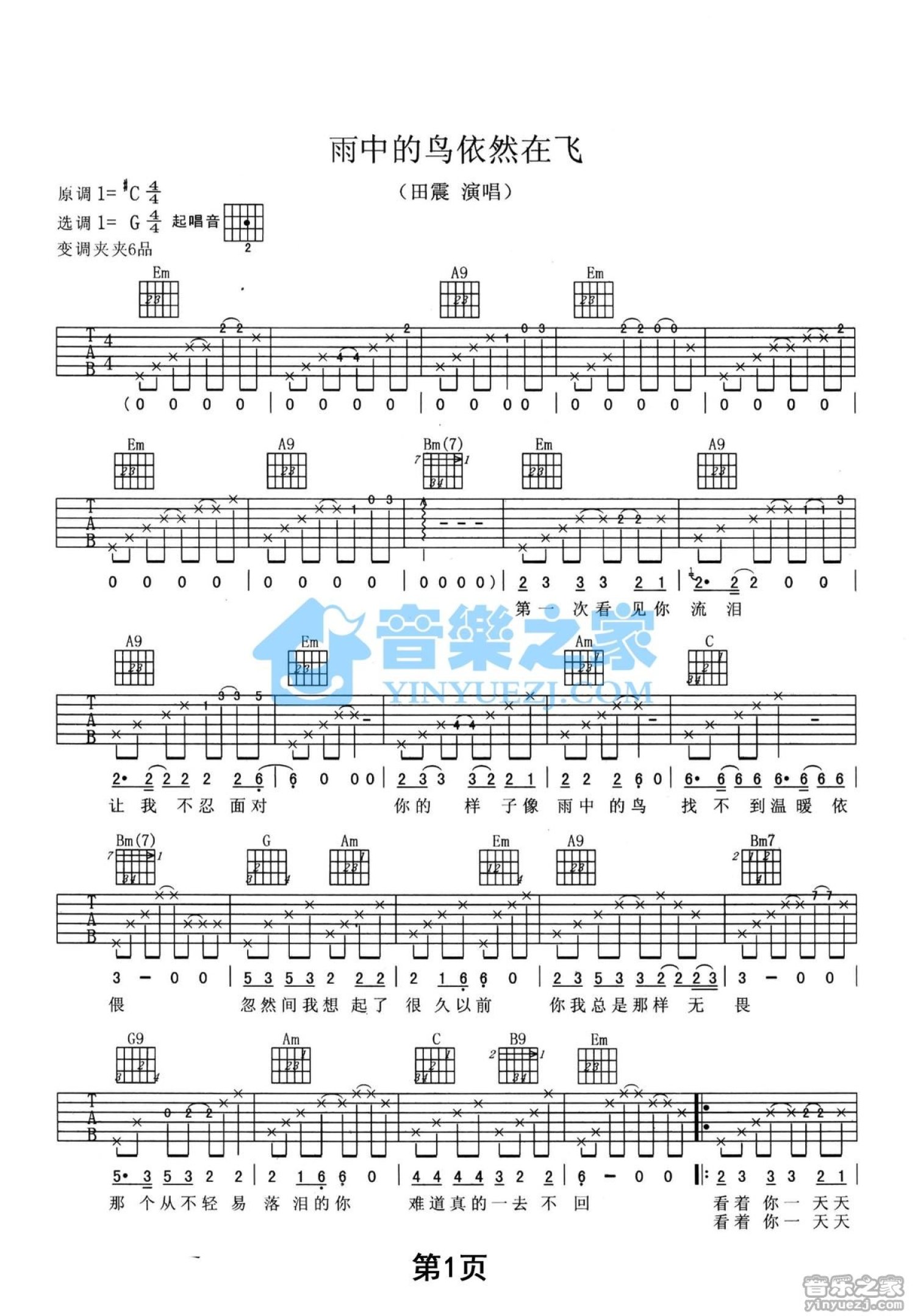 曲谱介绍: G调版田震《雨中的鸟依然在飞》吉他弹唱六线谱