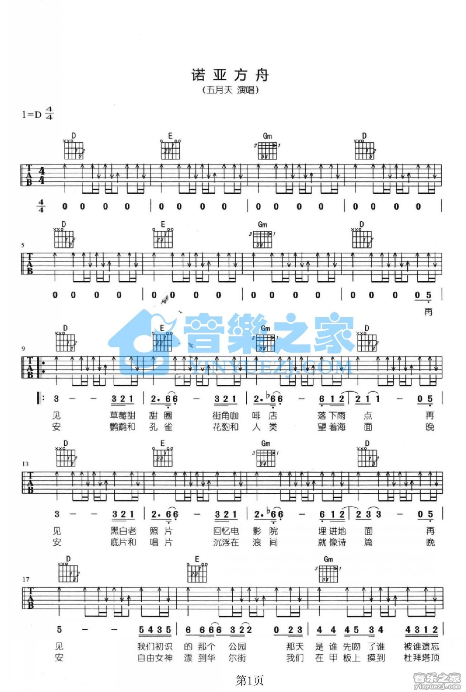 曲谱介绍: D调版 五月天《诺亚方舟》吉他弹唱六线谱