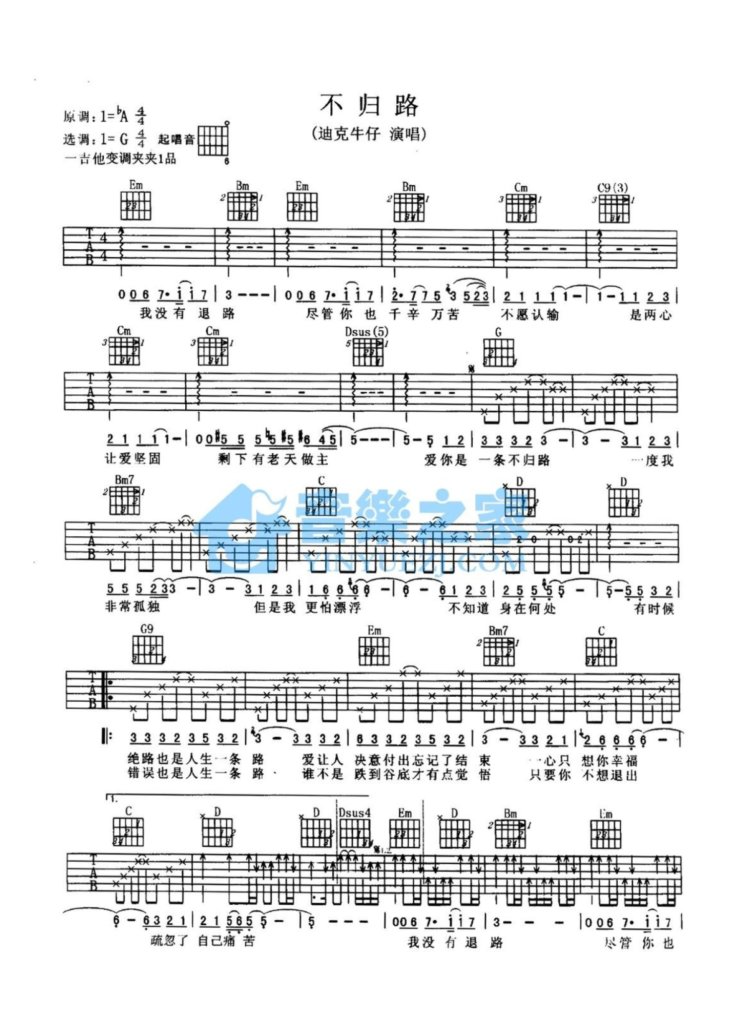 曲谱介绍: G调双吉他版迪克牛仔《不归路》吉他弹唱六线谱