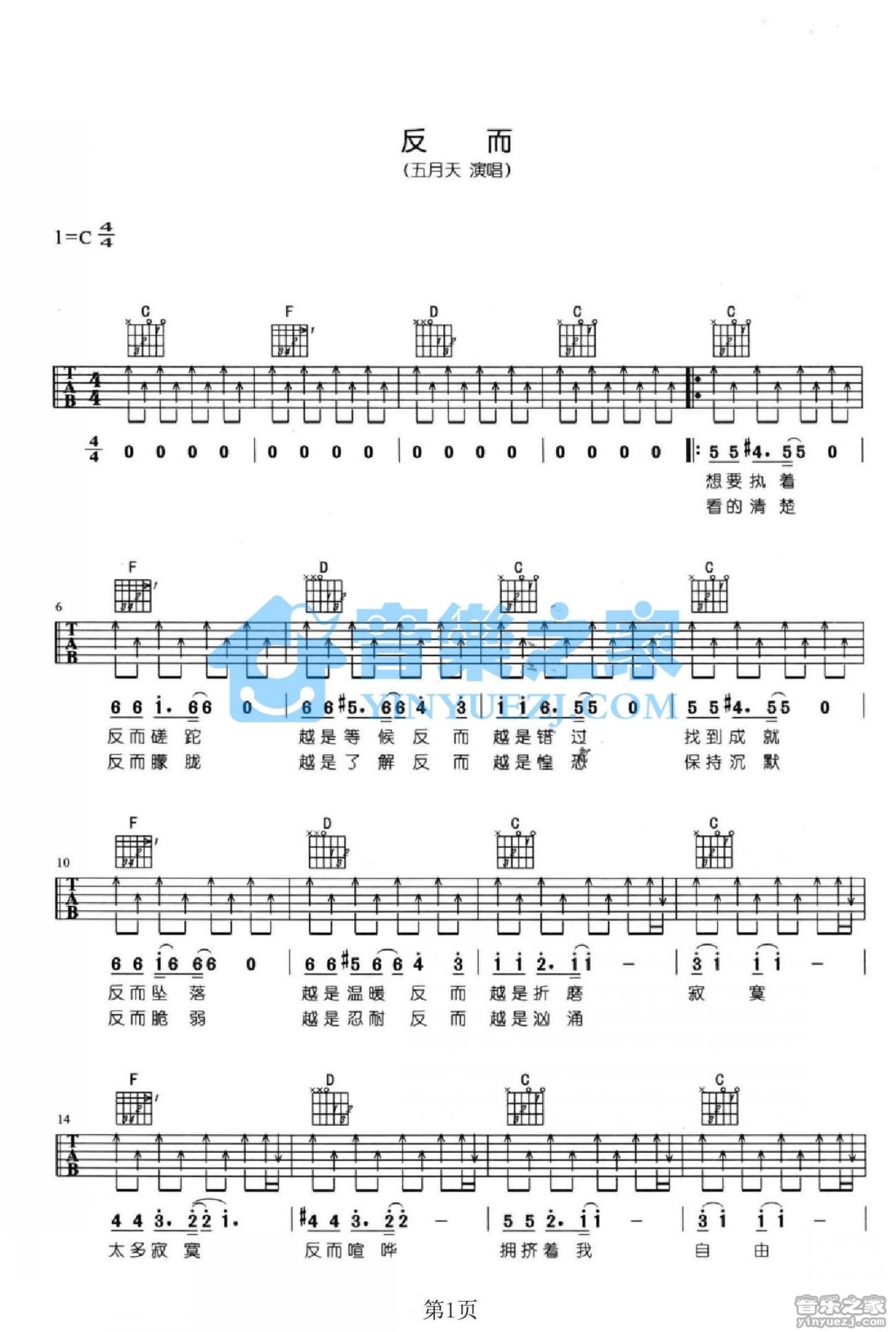 曲谱介绍: C调版 五月天《反而》吉他弹唱六线谱
