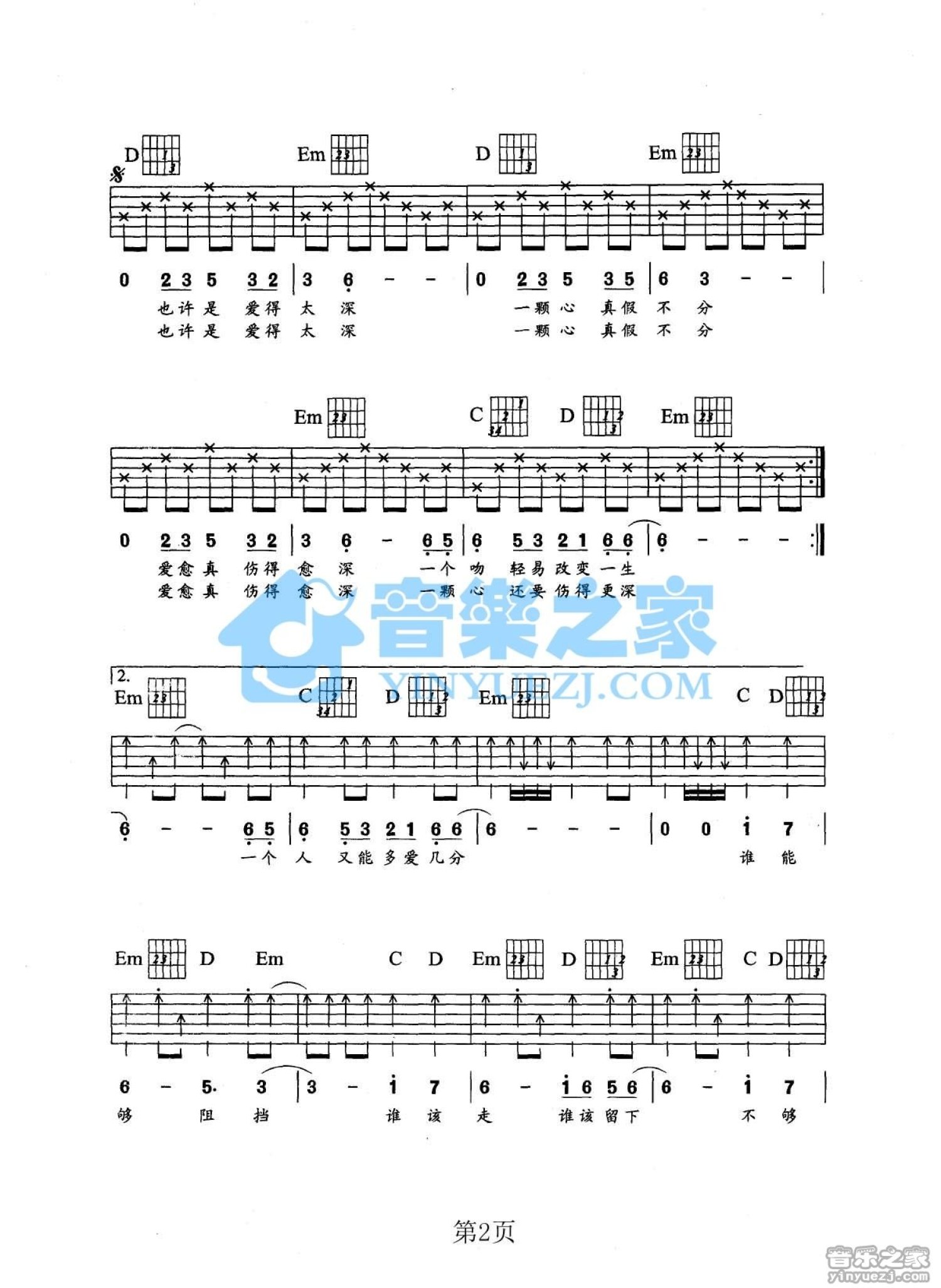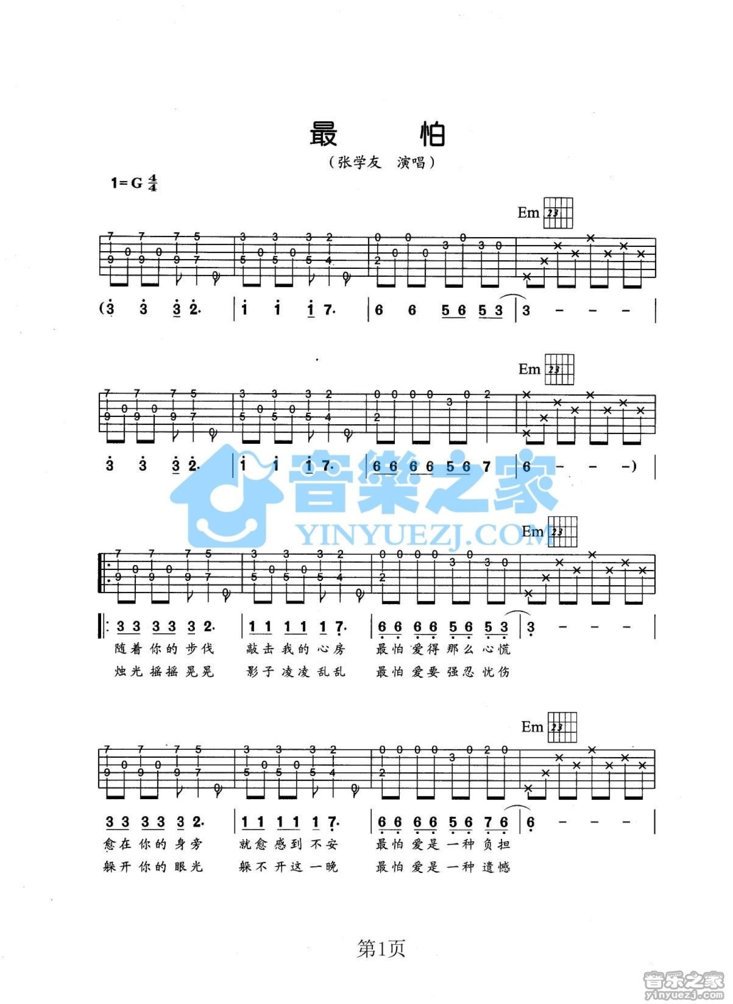 曲谱介绍: G调版 张学友《最怕》吉他弹唱六线谱