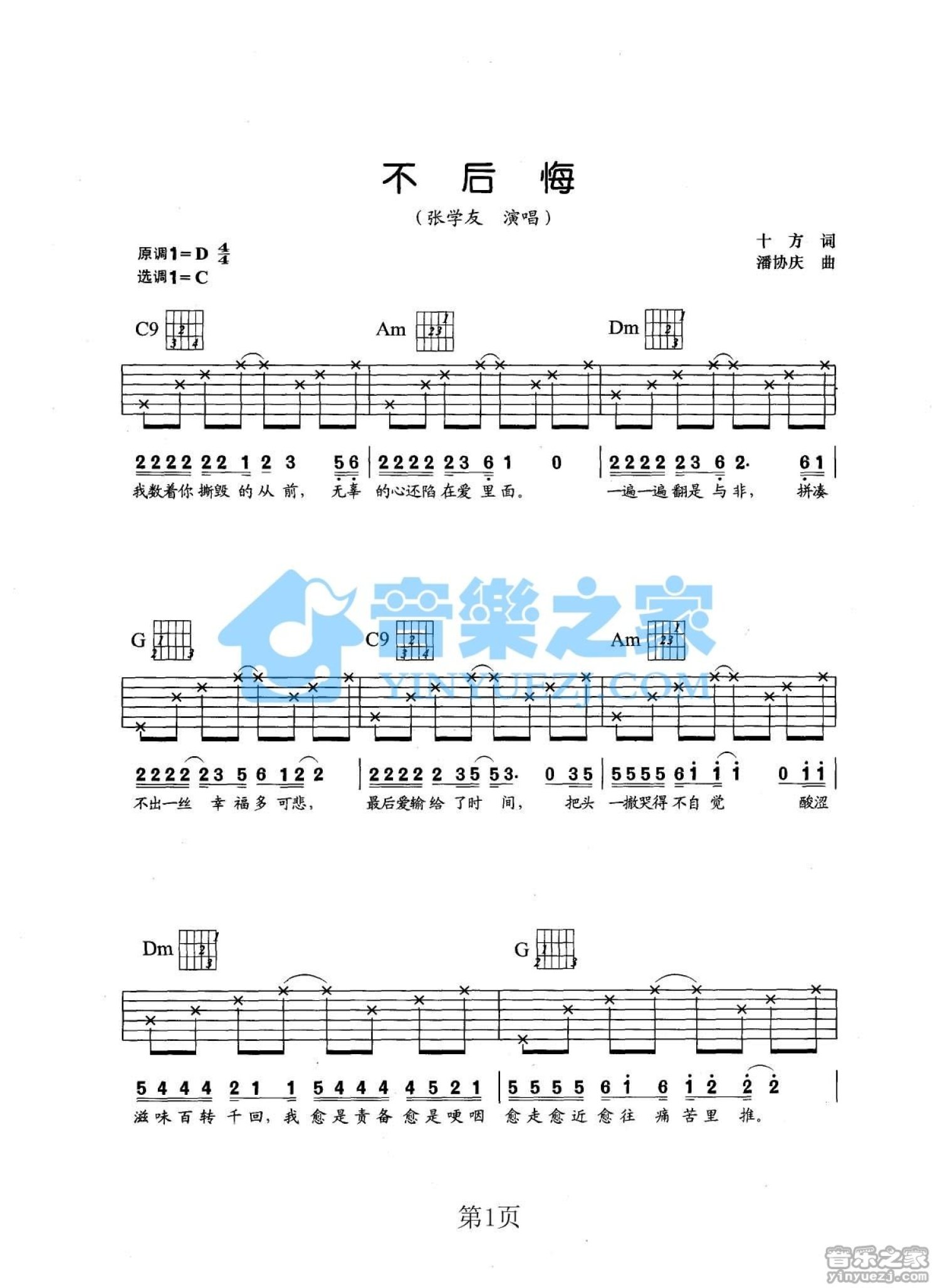 曲谱介绍: C调版 张学友《不后悔》吉他弹唱六线谱