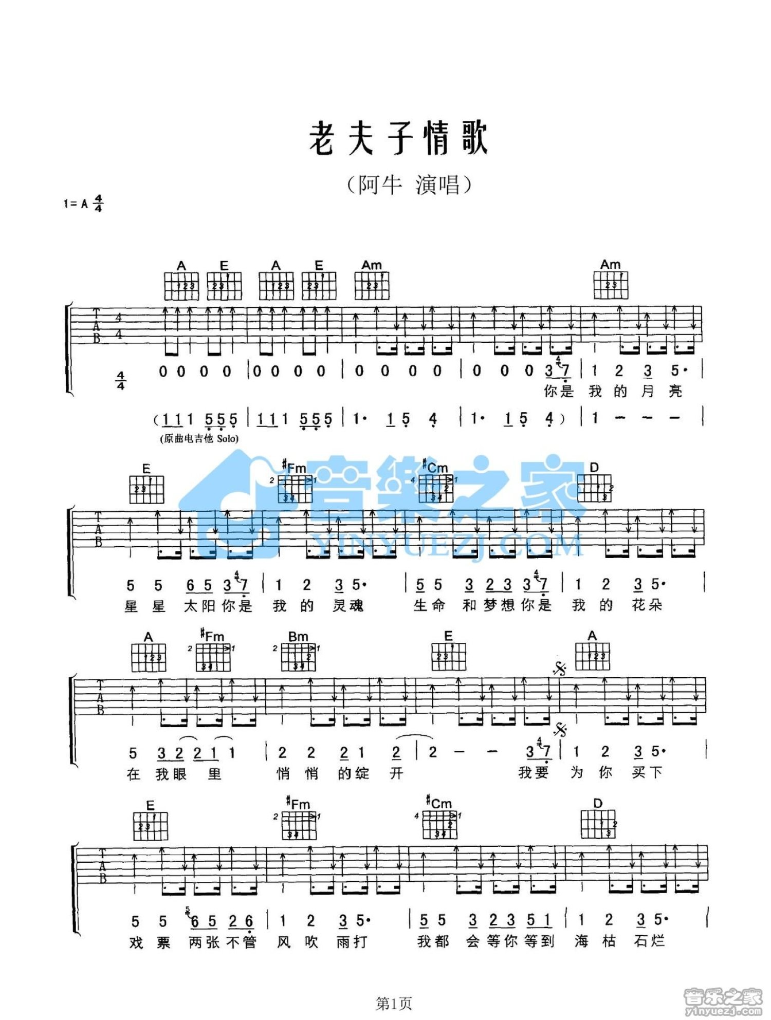 曲谱介绍: A调版 阿牛《老夫子情歌》吉他弹唱六线谱
