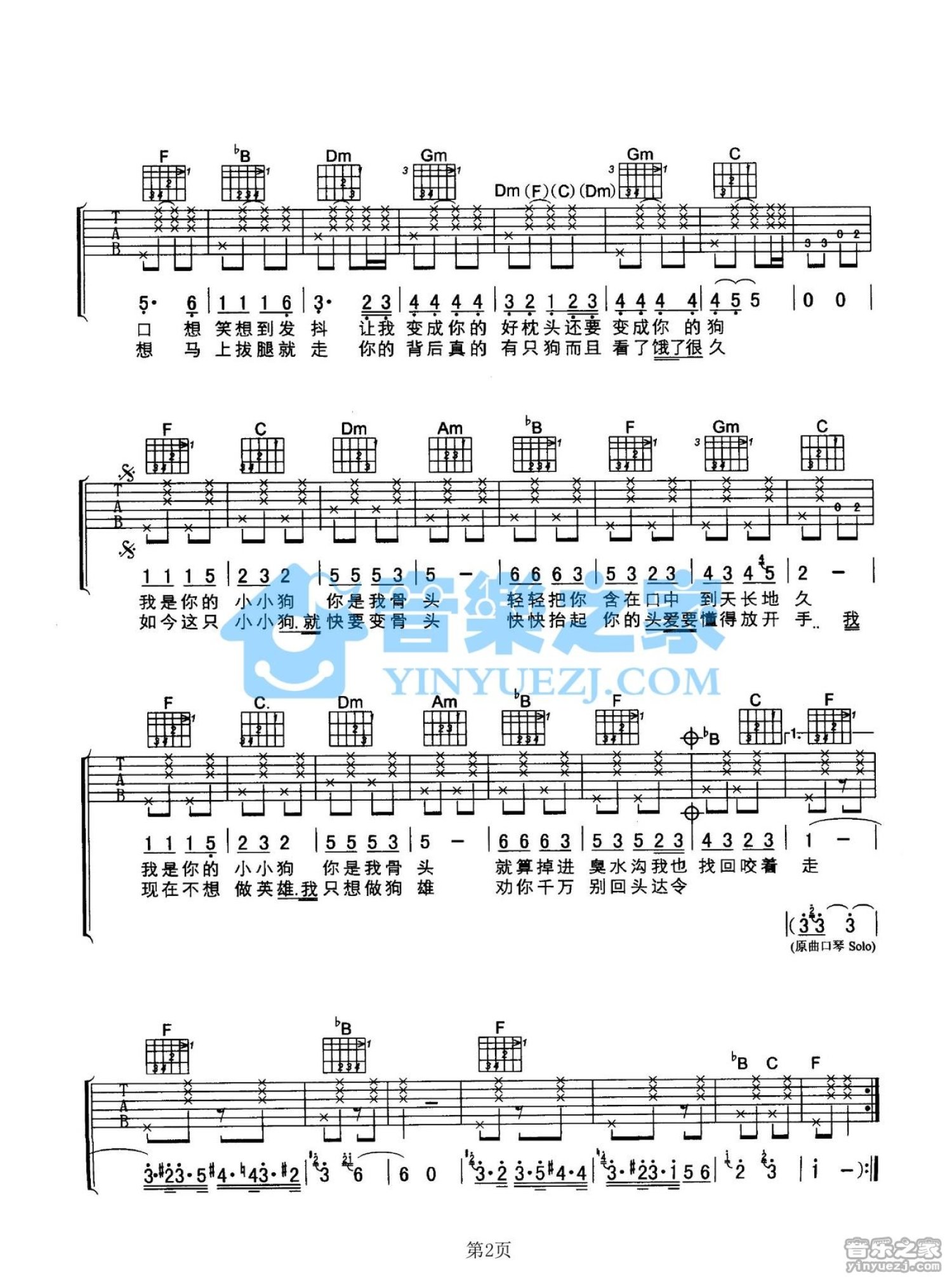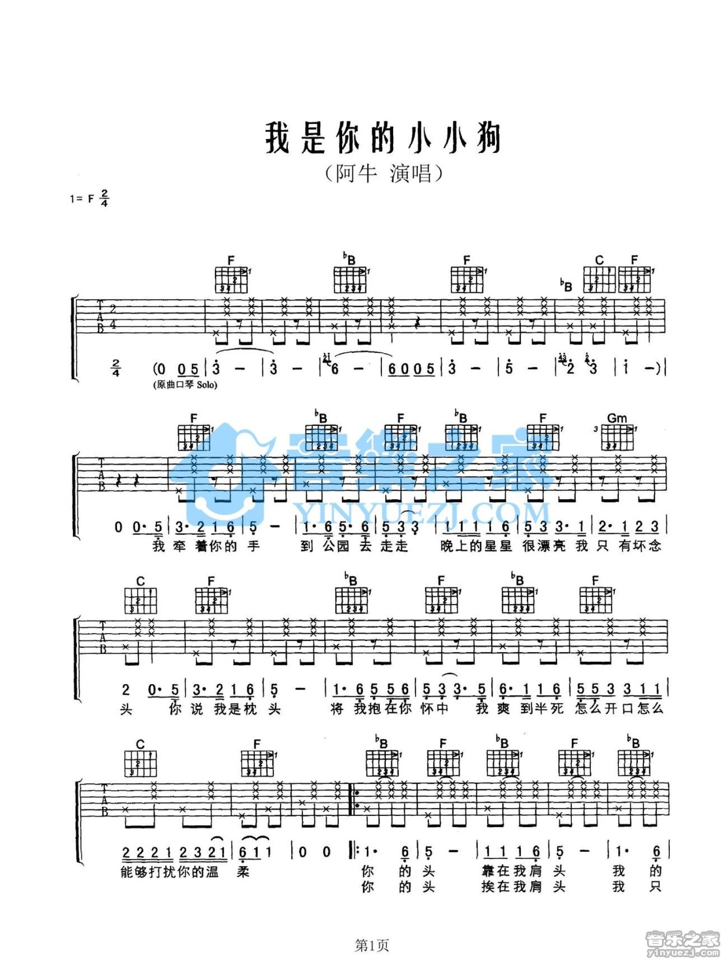 曲谱介绍: F调版阿牛《我是你的小小狗》吉他弹唱六线谱