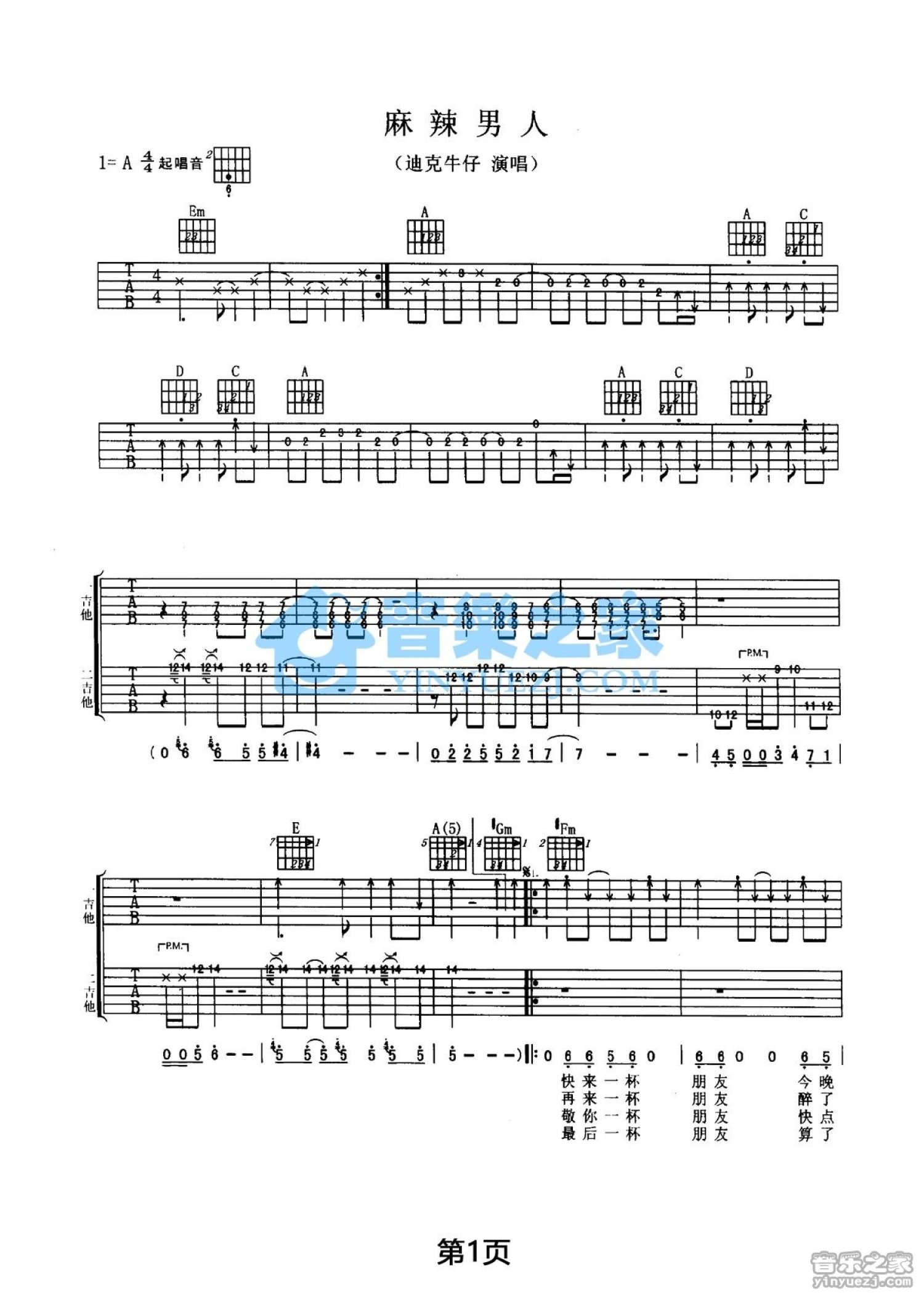 曲谱介绍: A调双吉他版 迪克牛仔《麻辣男人》吉他弹唱六线谱