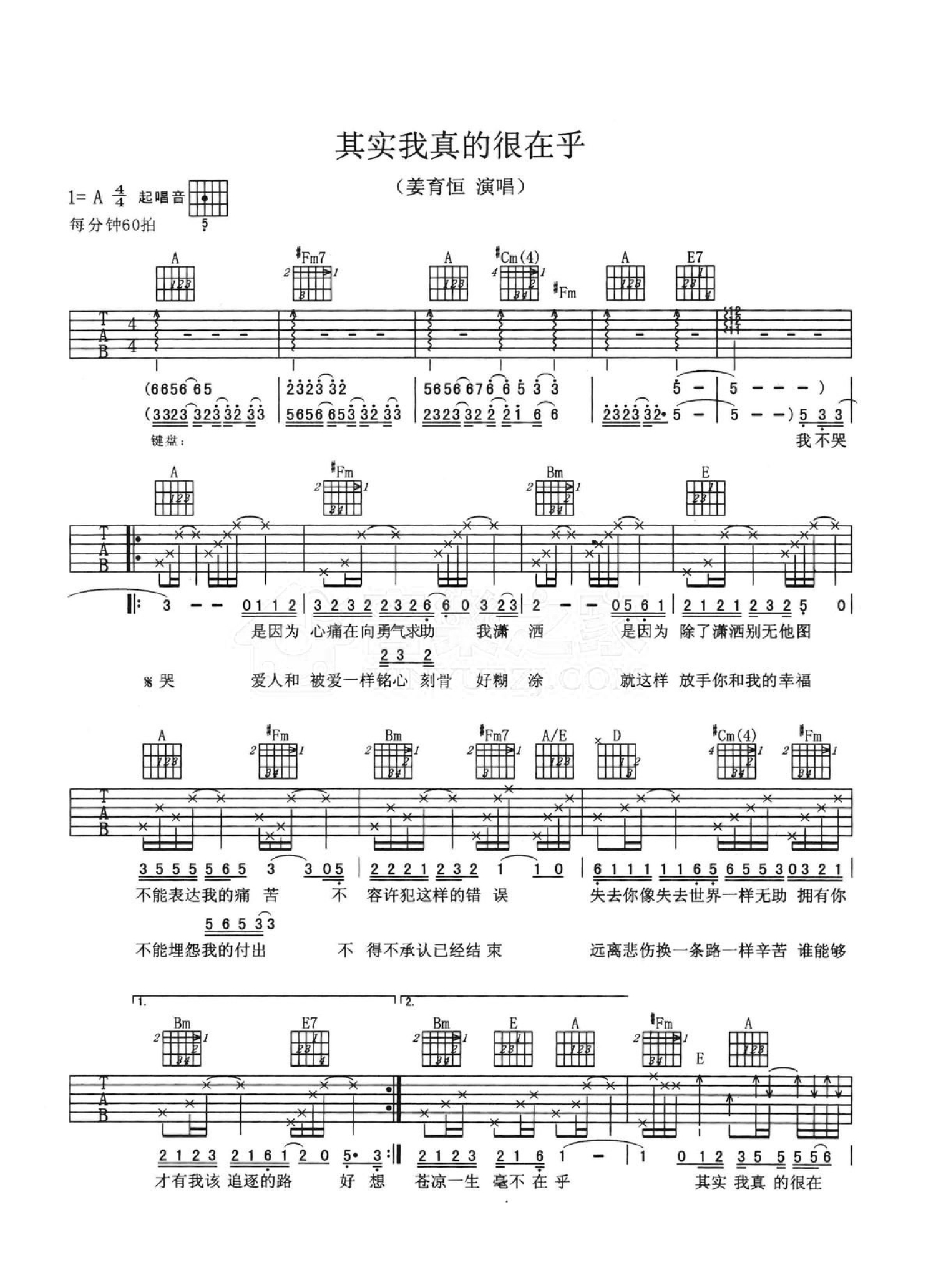 曲谱介绍: A调版姜育恒《其实我真的很在乎》吉他弹唱六线谱