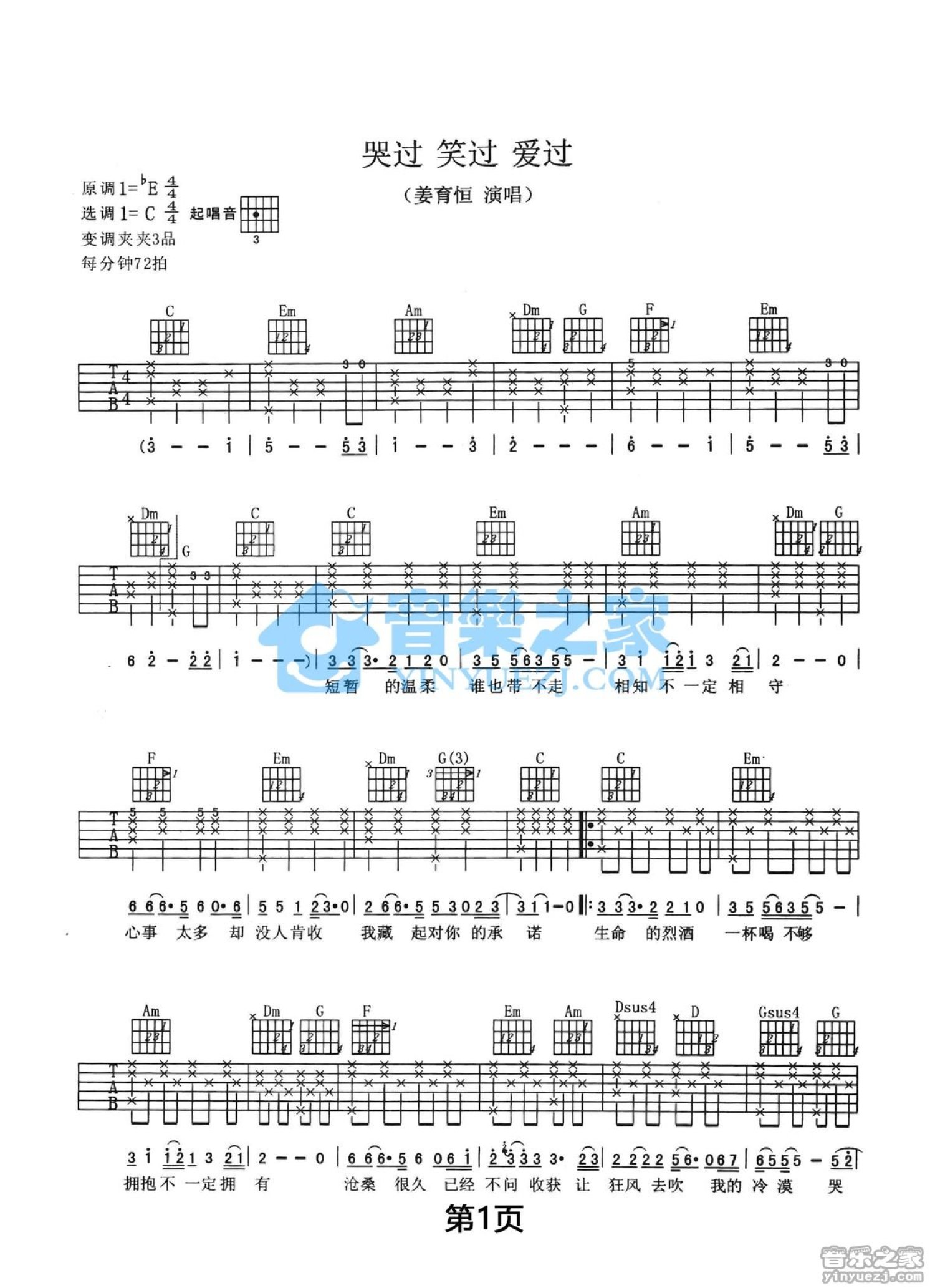 曲谱介绍: C调版 姜育恒《哭过爱过笑过》吉他弹唱六线谱