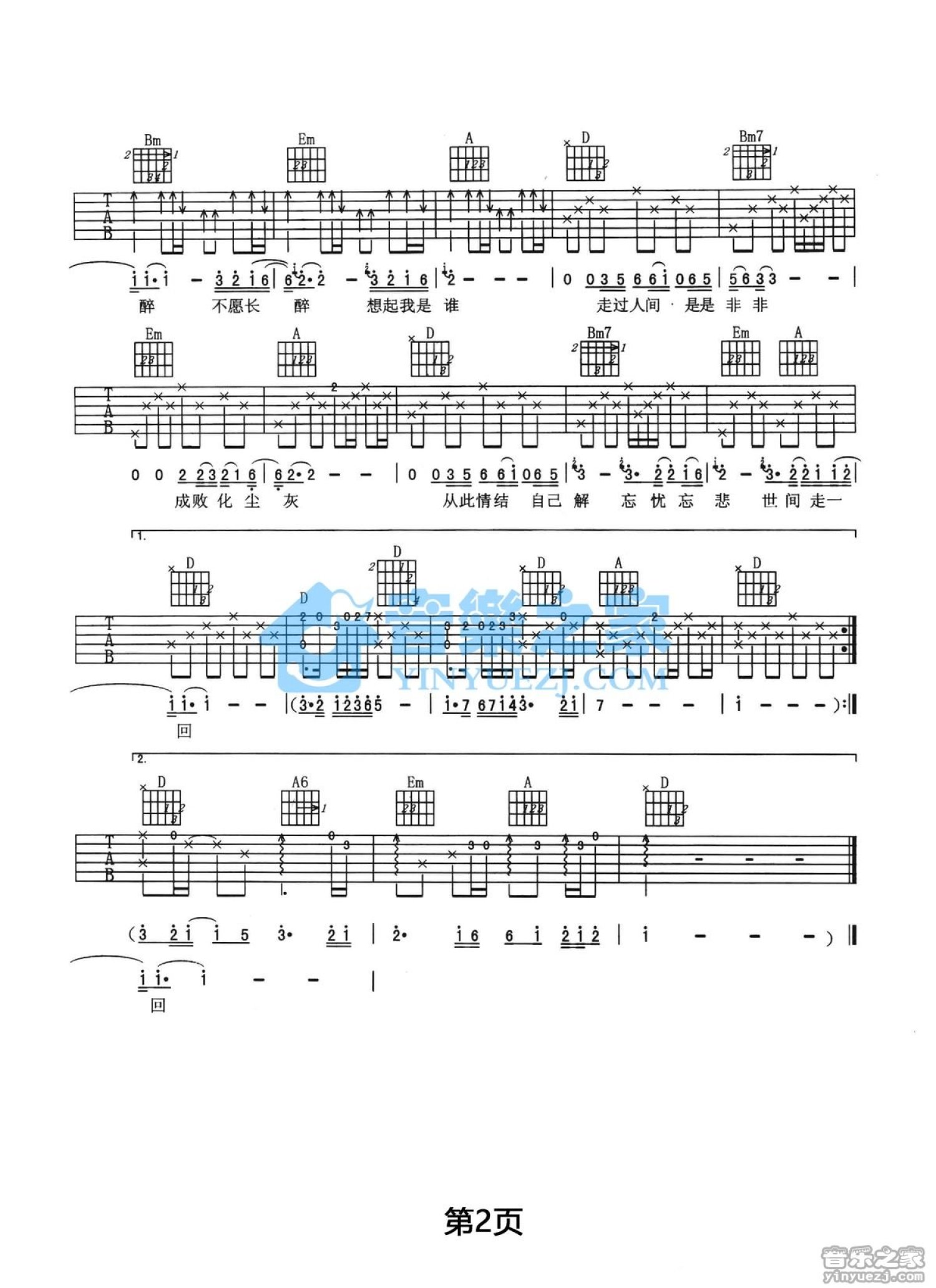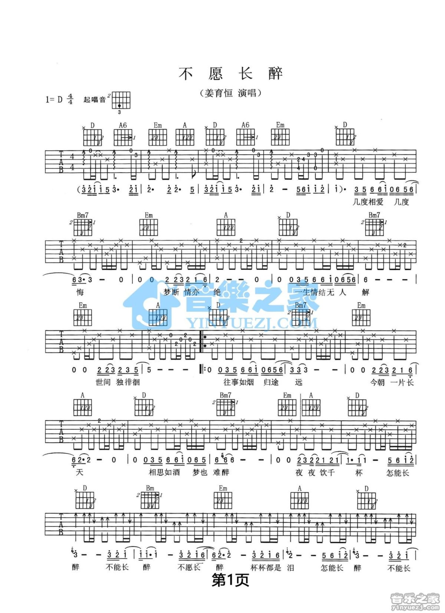 曲谱介绍: D调版姜育恒《不愿长醉》吉他弹唱六线谱