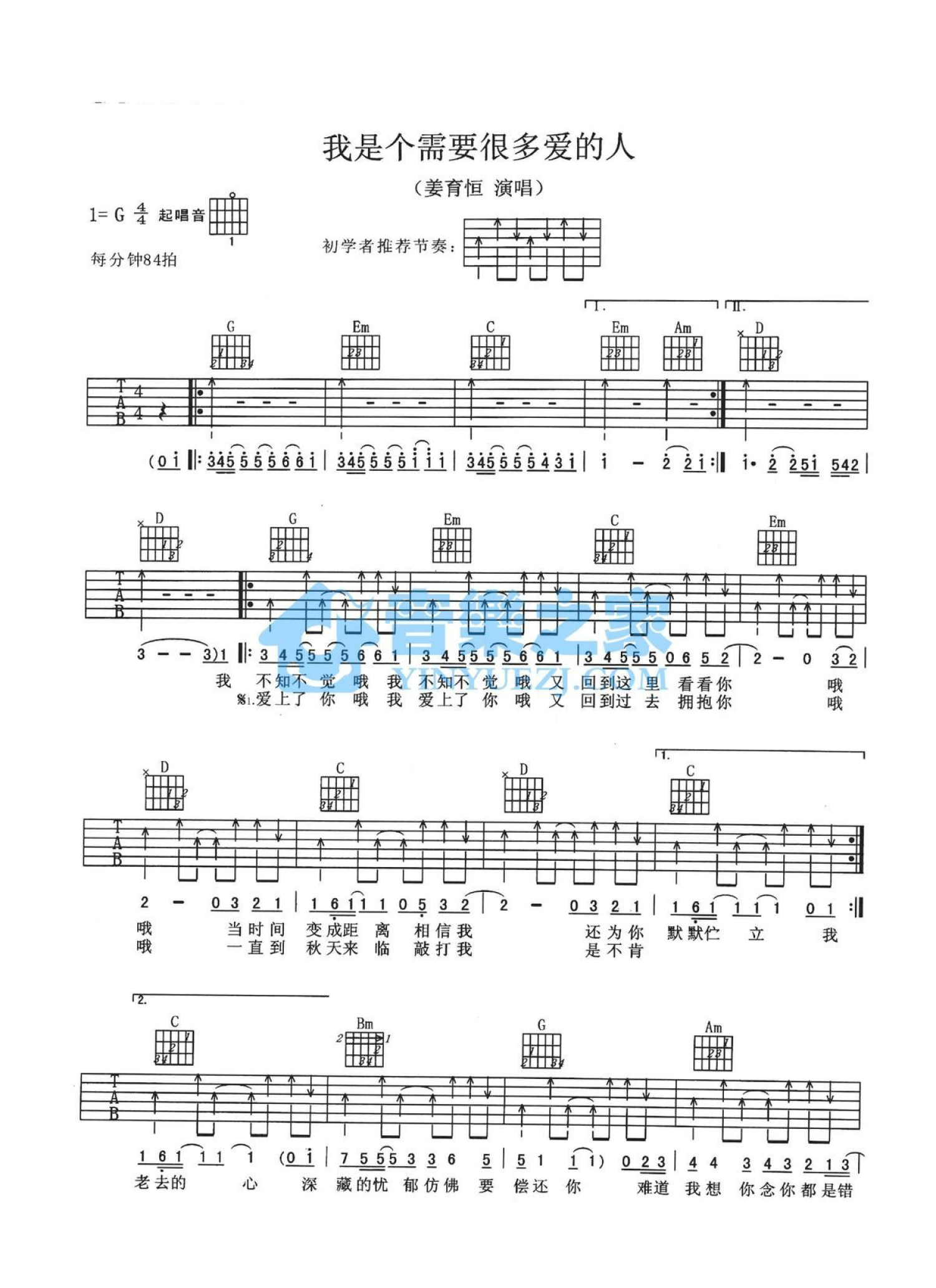 曲谱介绍: G调版 姜育恒《我是个需要很多爱的人》吉他弹唱六线谱