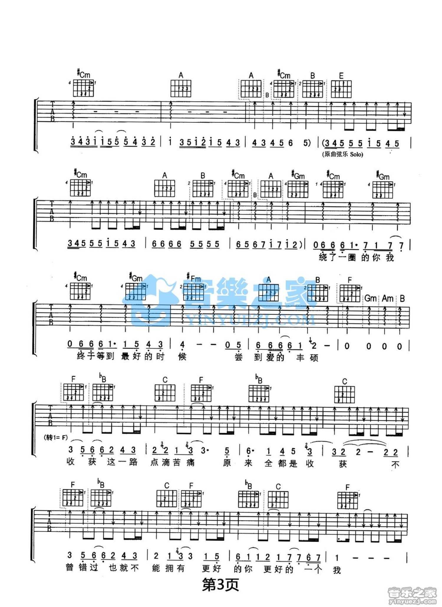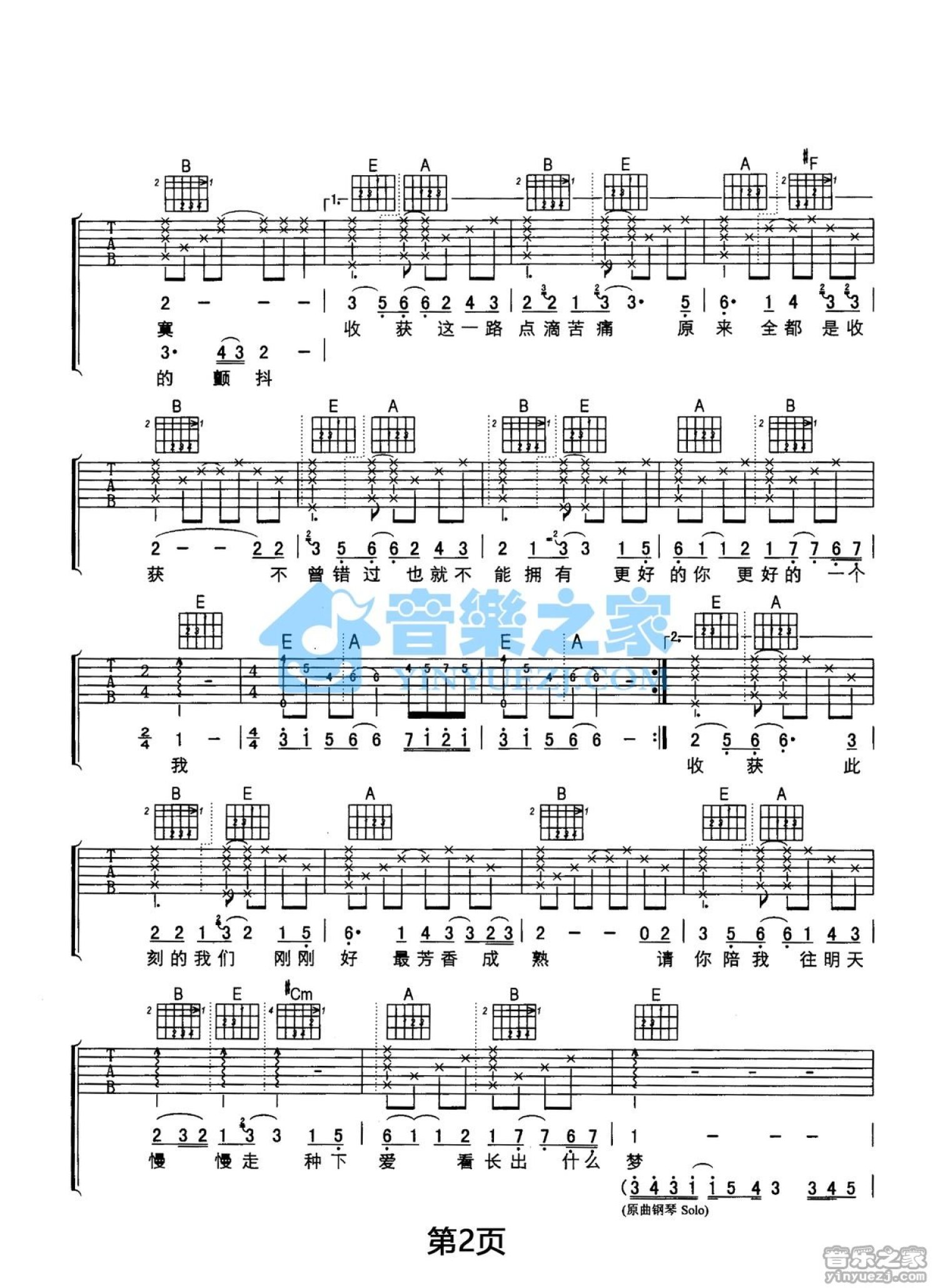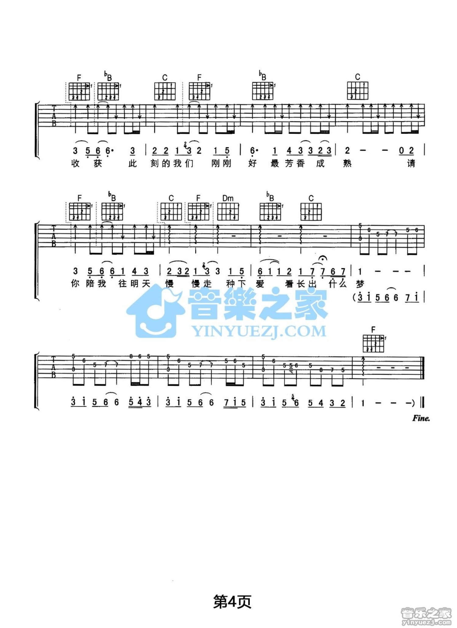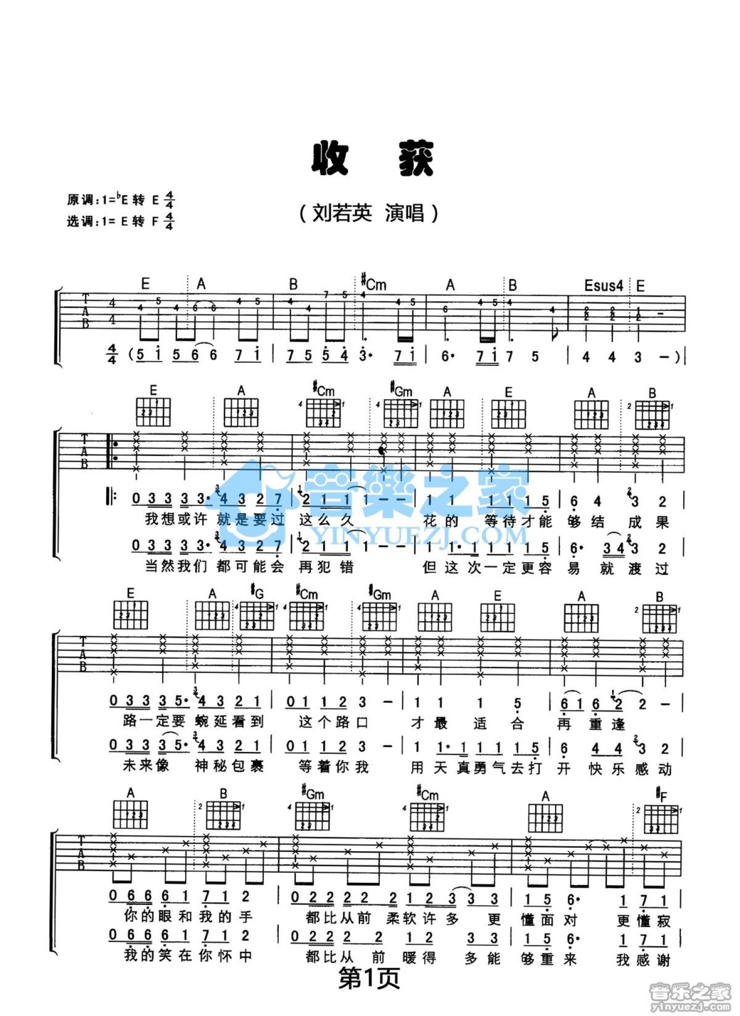 曲谱介绍: E转F调版 刘若英《收获》吉他弹唱六线谱
