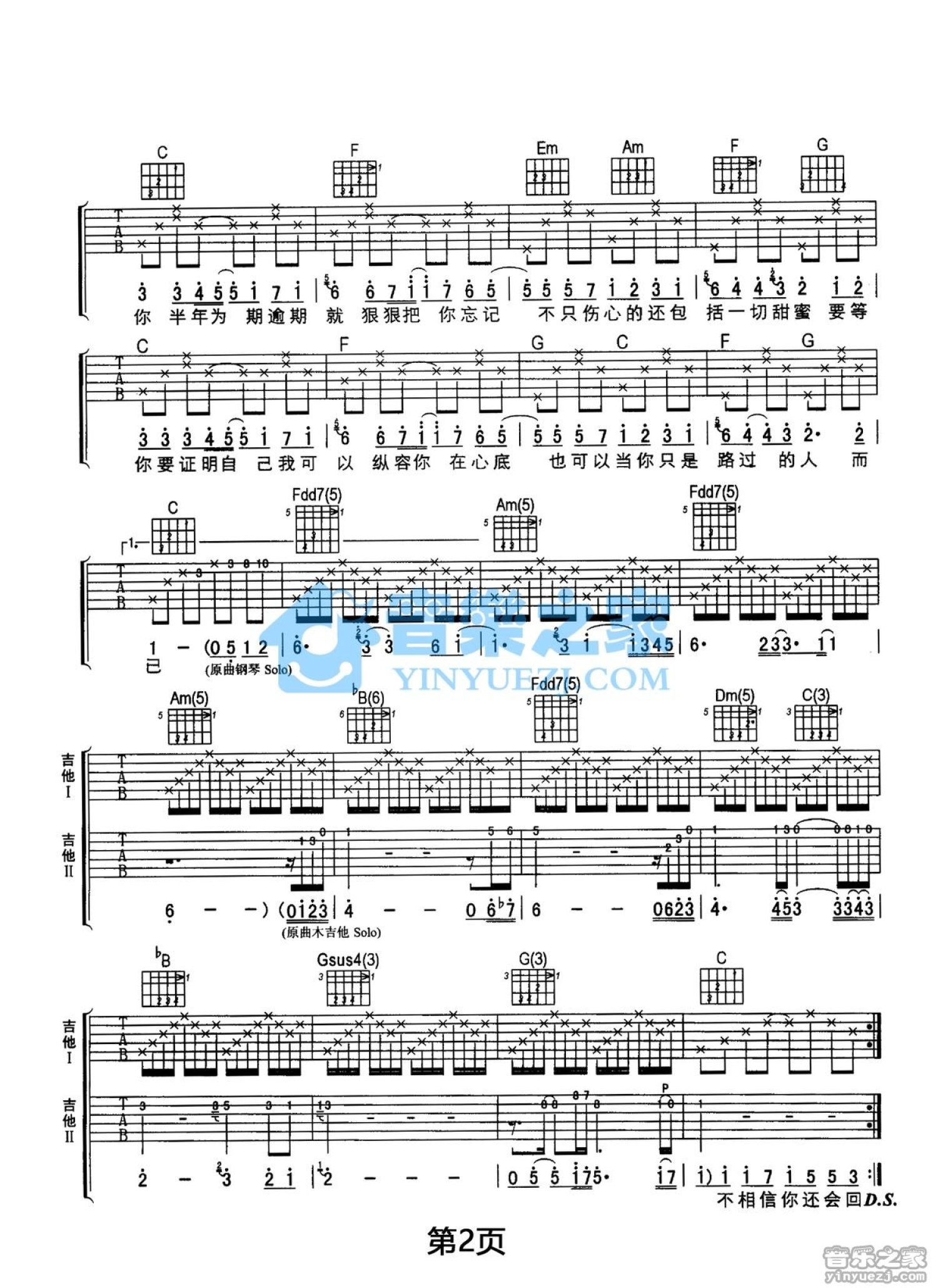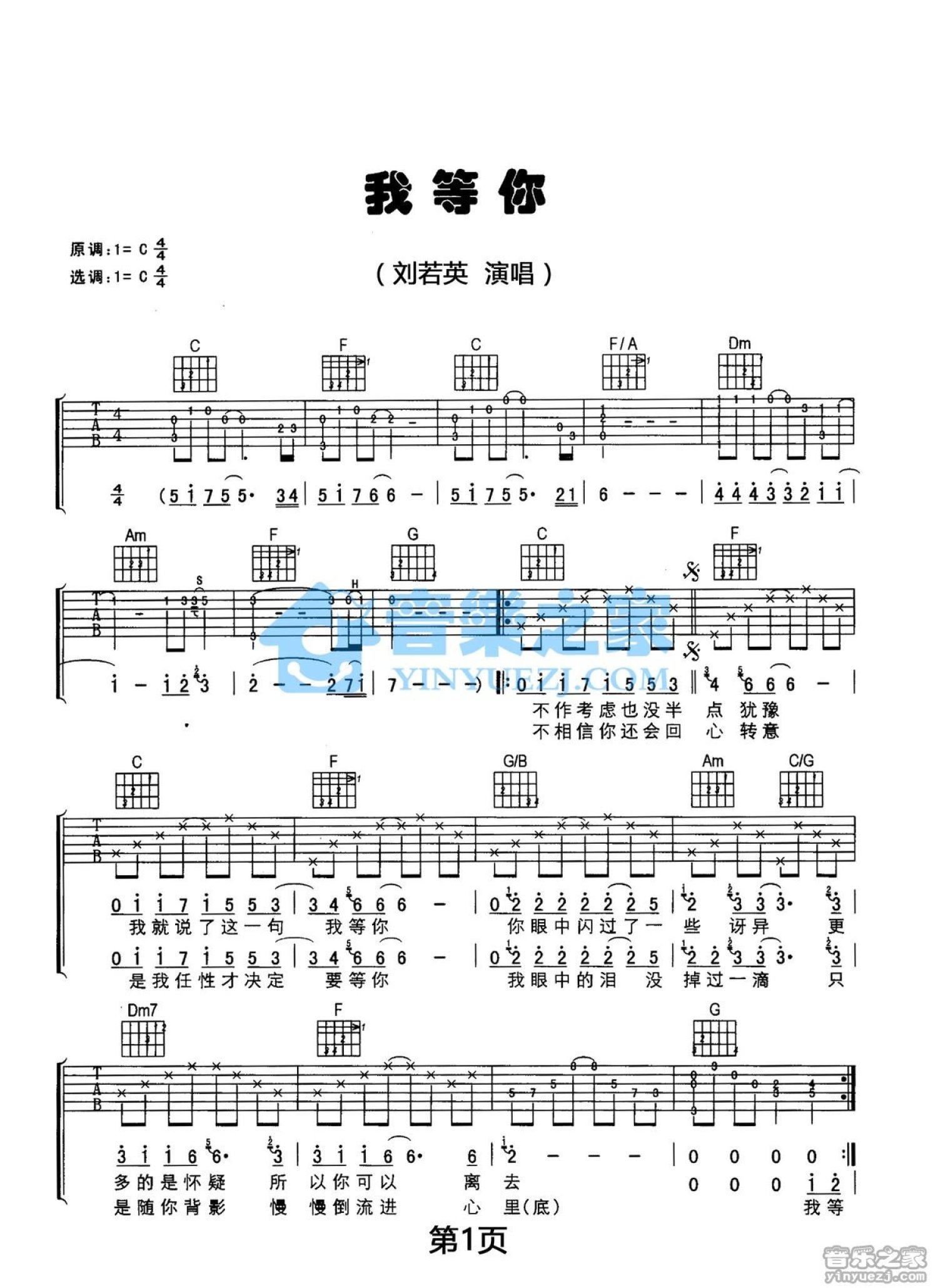 曲谱介绍: C调双吉他版刘若英《我等你》吉他弹唱六线谱