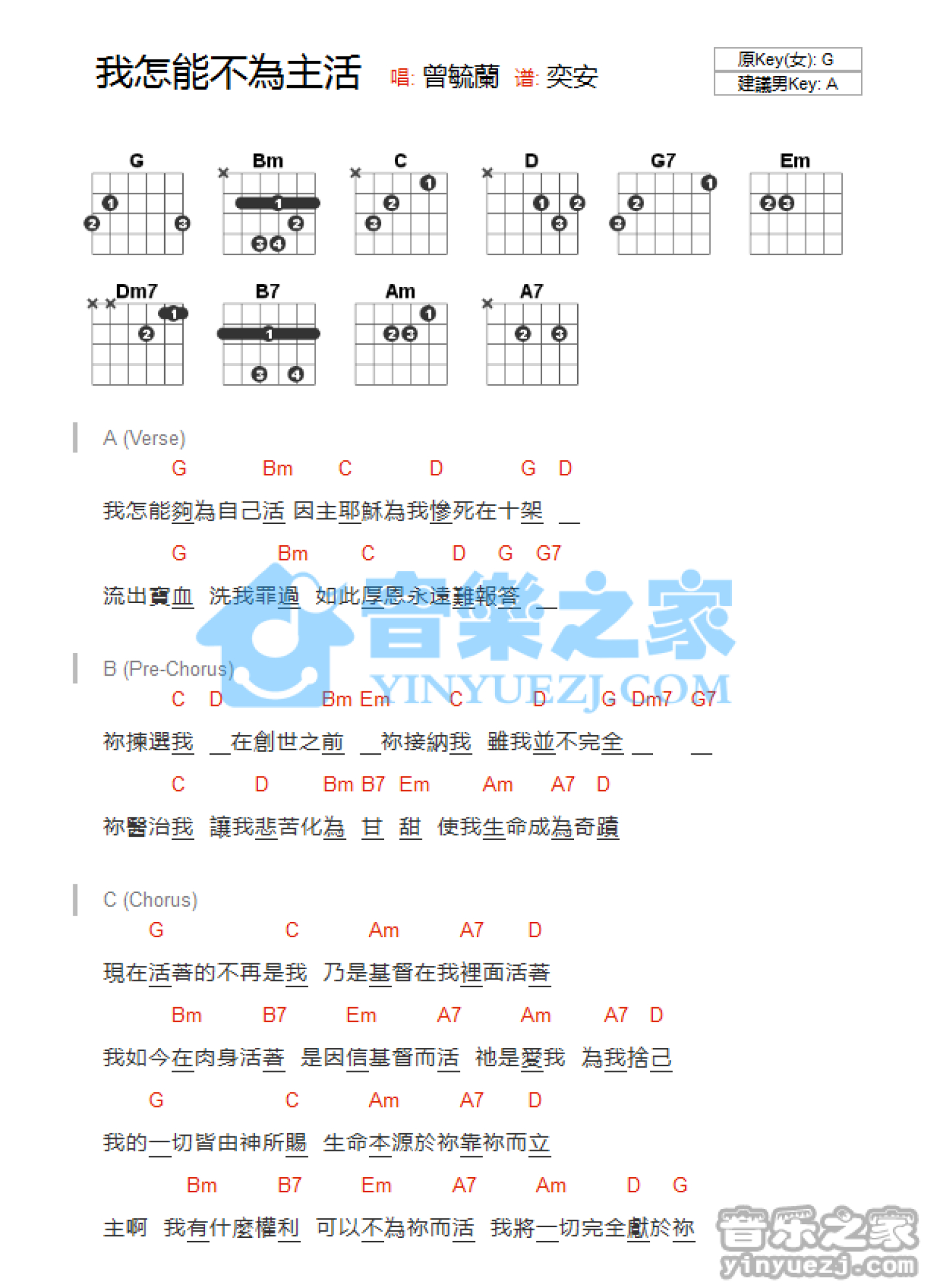 曲谱介绍: G调版曾毓兰《我怎能不为主活吉他和弦弹唱谱