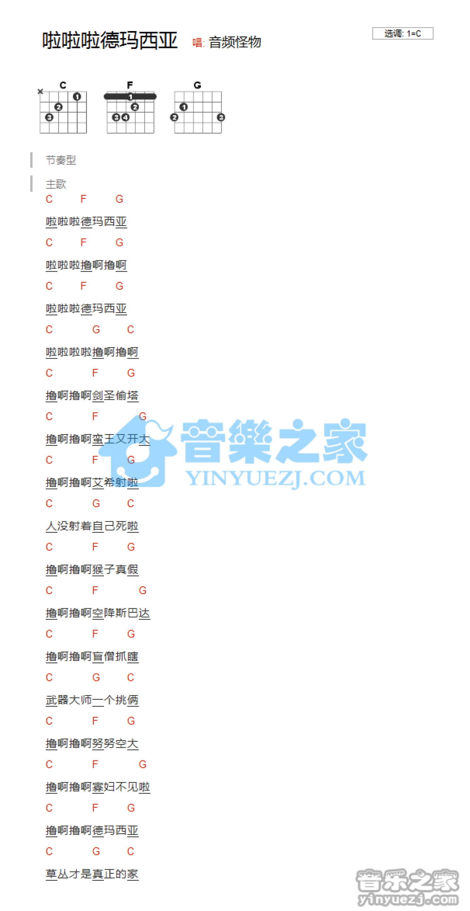 曲谱介绍: C调版音频怪物《啦啦啦德玛西亚》吉他和弦弹唱谱