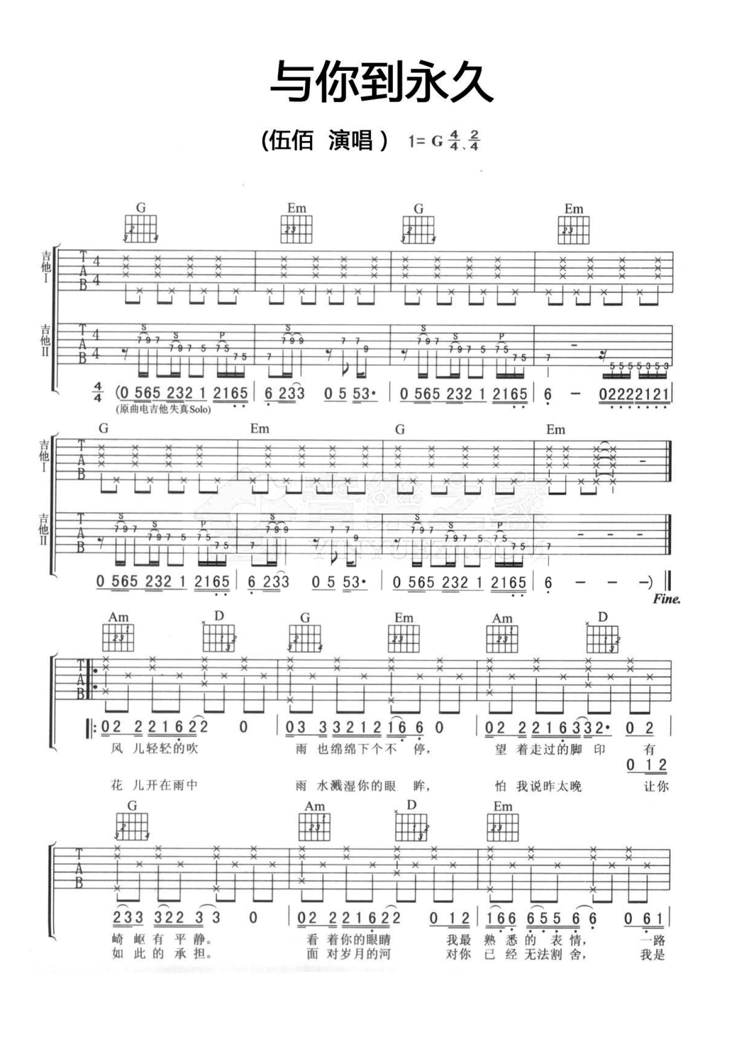 曲谱介绍: G调双吉他版伍佰《与你到永远》吉他弹唱六线谱