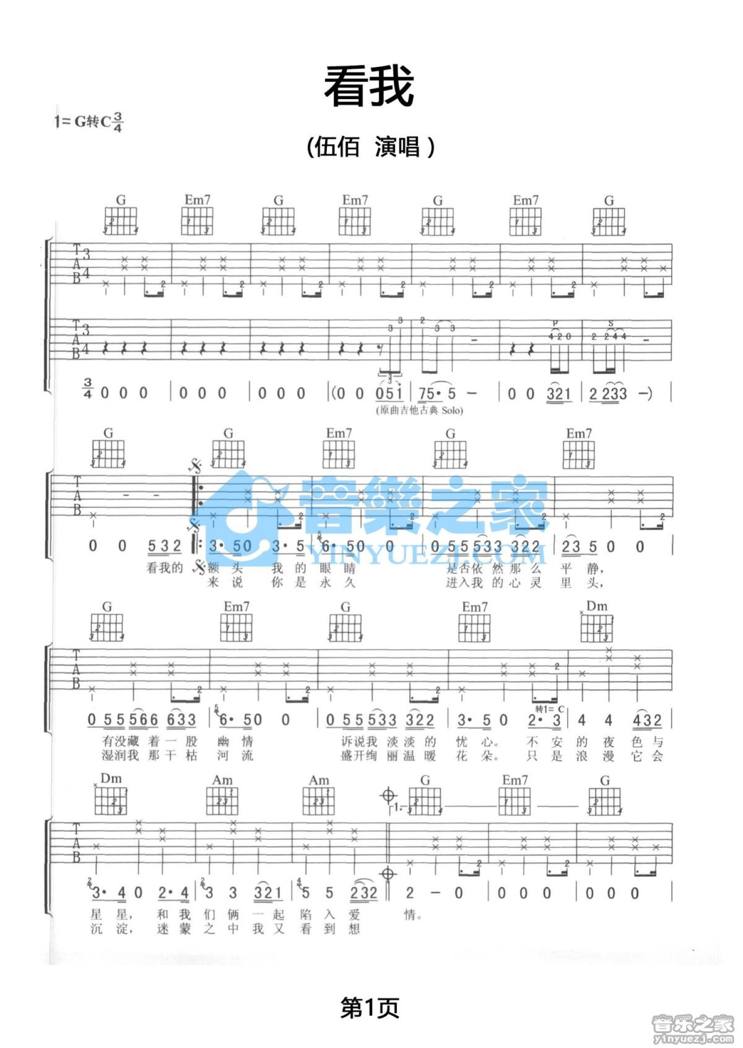 曲谱介绍: G转C调双吉他版 伍佰《看我》吉他弹唱六线谱