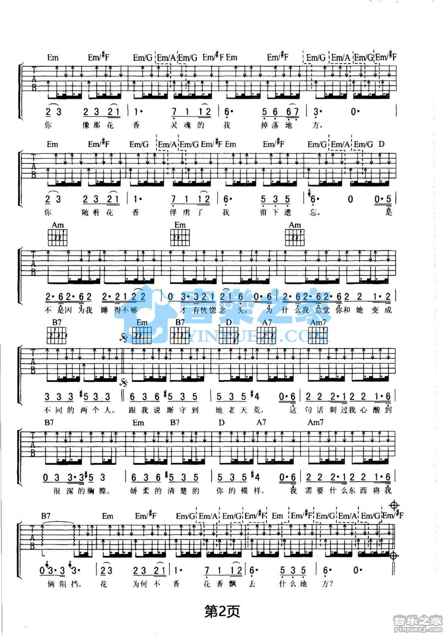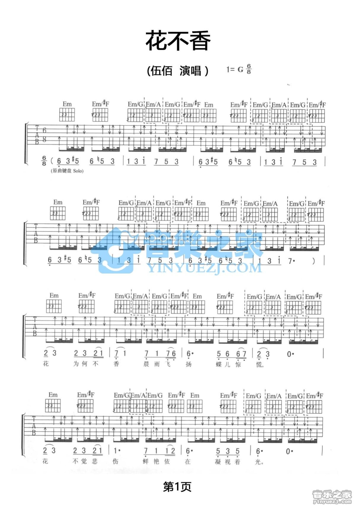 曲谱介绍: G调版《花不香》吉他弹唱六线谱
