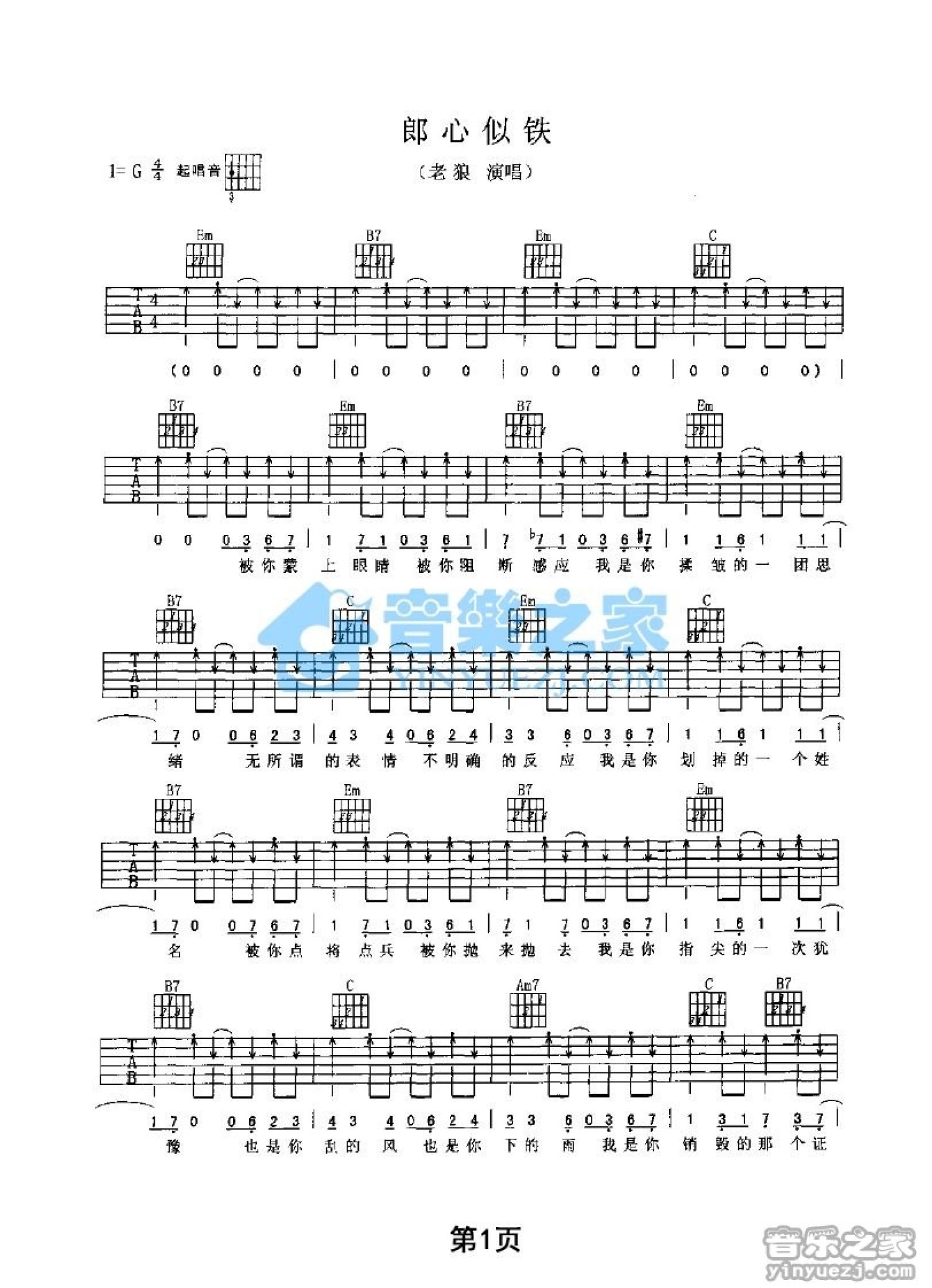 曲谱介绍: G调版《郎心似铁》吉他弹唱六线谱