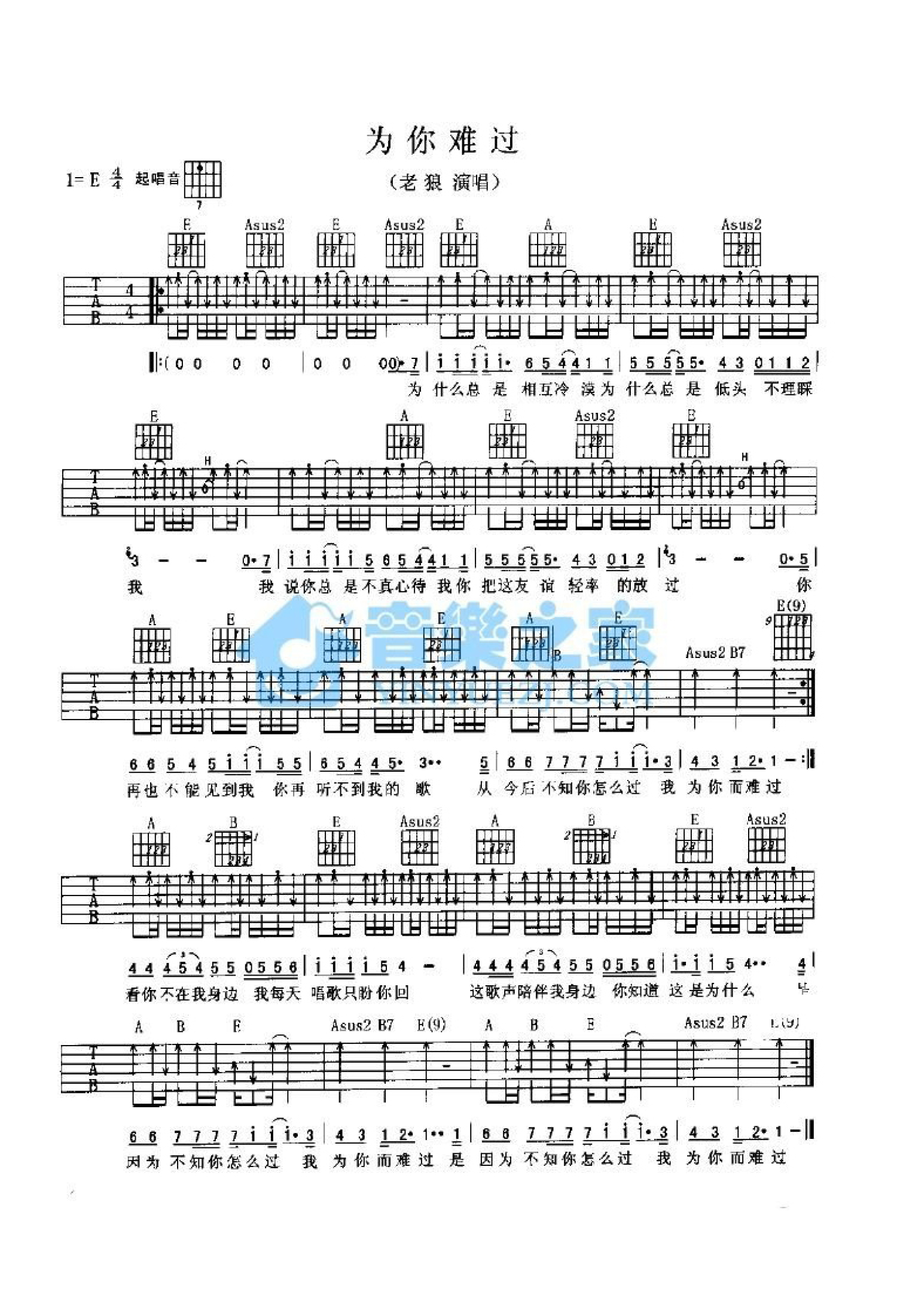 为你难过吉他谱 - 老狼 - E调吉他弹唱谱