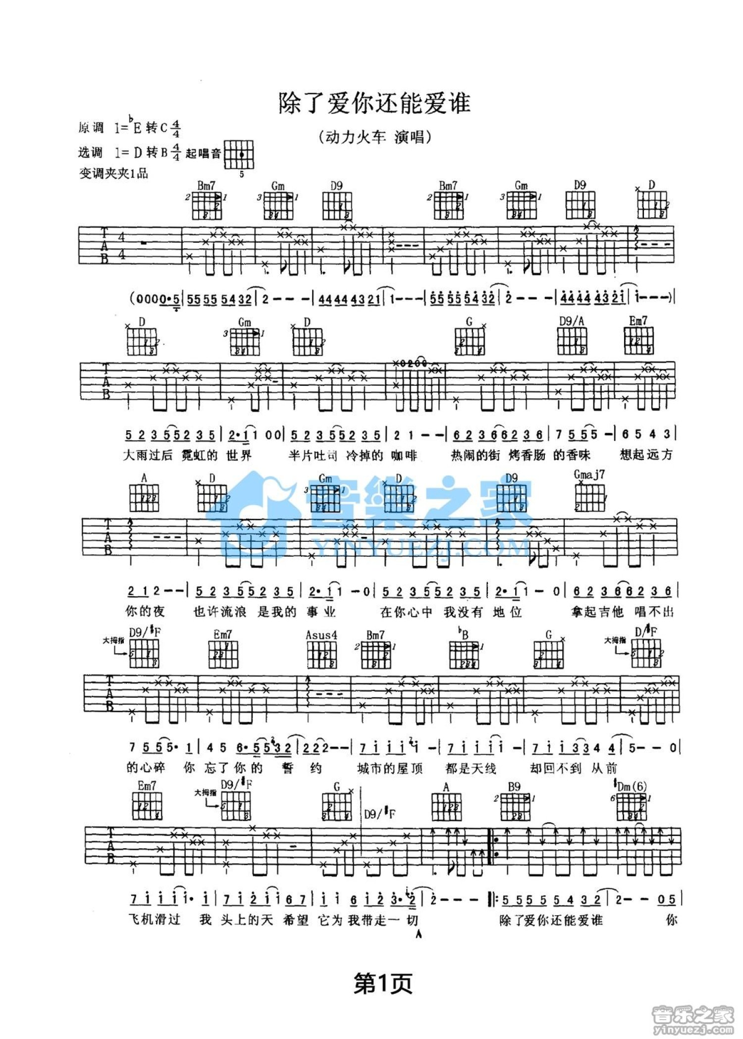 曲谱介绍: D调版《除了爱你还能爱谁》吉他弹唱六线谱
