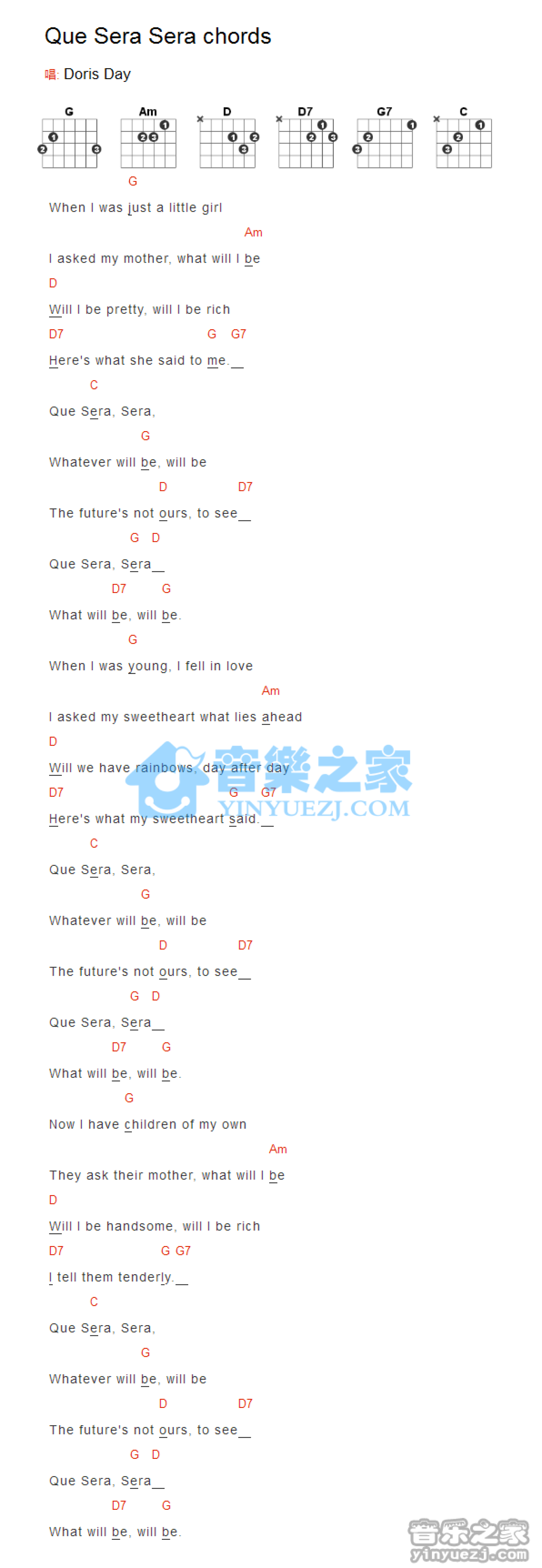 曲谱介绍: 《Que Sera Sera Chords》吉他和弦弹唱谱