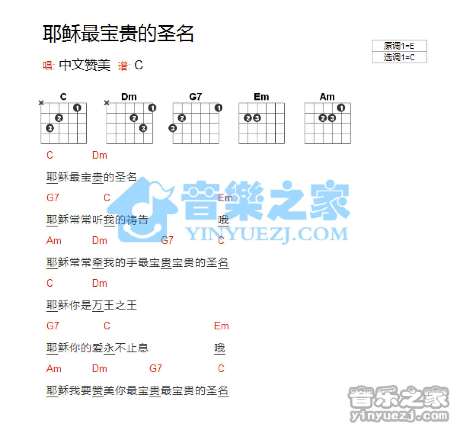 曲谱介绍: C调版《耶稣最宝贵的圣名》吉他和弦弹唱谱