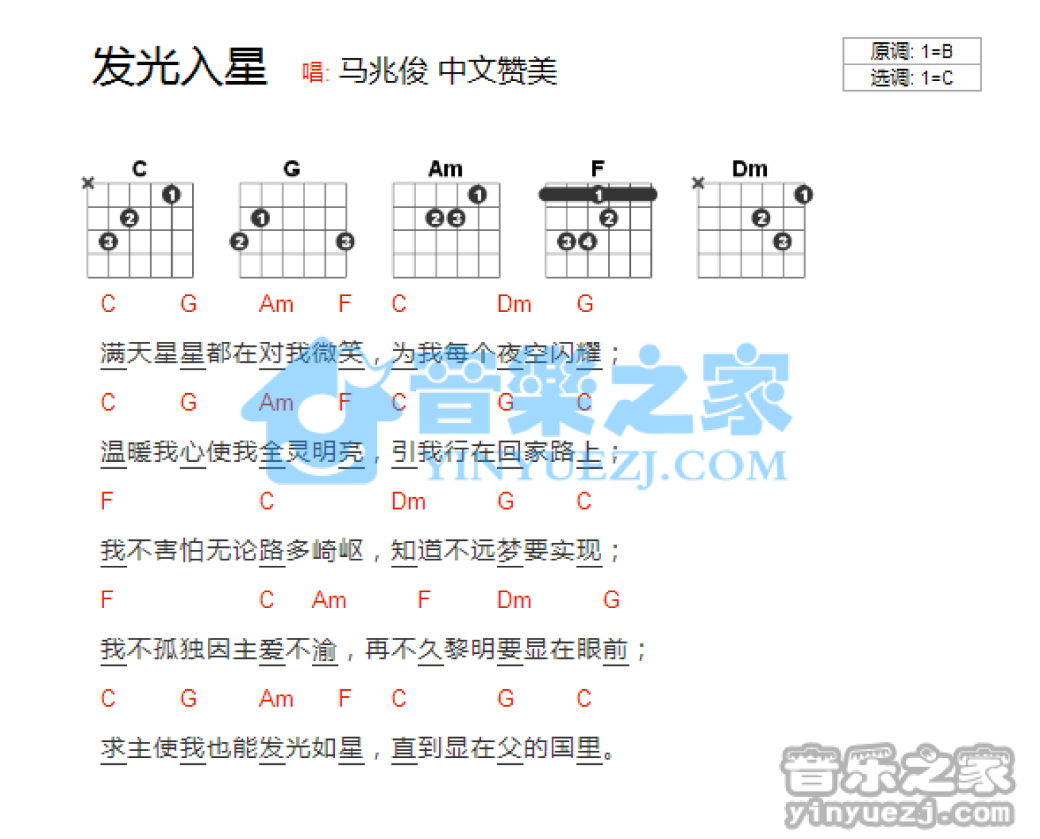 曲谱介绍: C调版《发光如星》吉他和弦弹唱谱