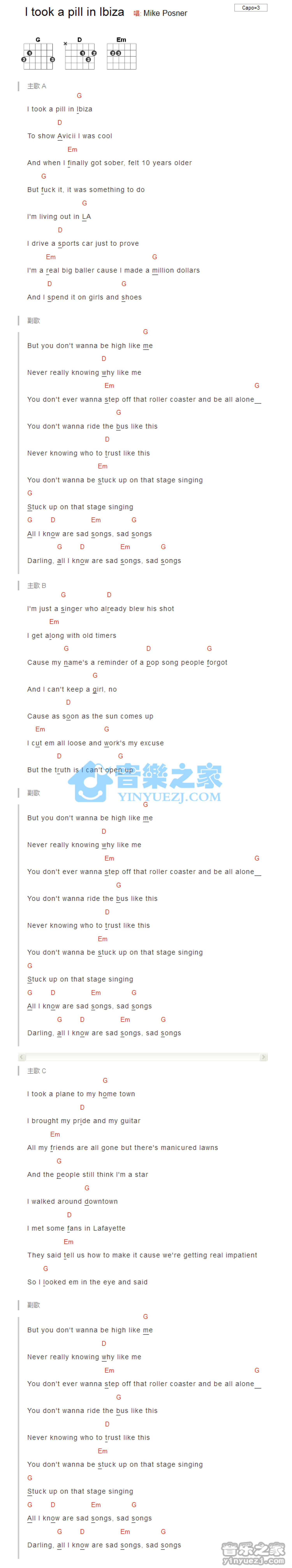 I took a pill in lbiza吉他谱 - MikePosner - G调吉他弹唱谱 - 和弦谱