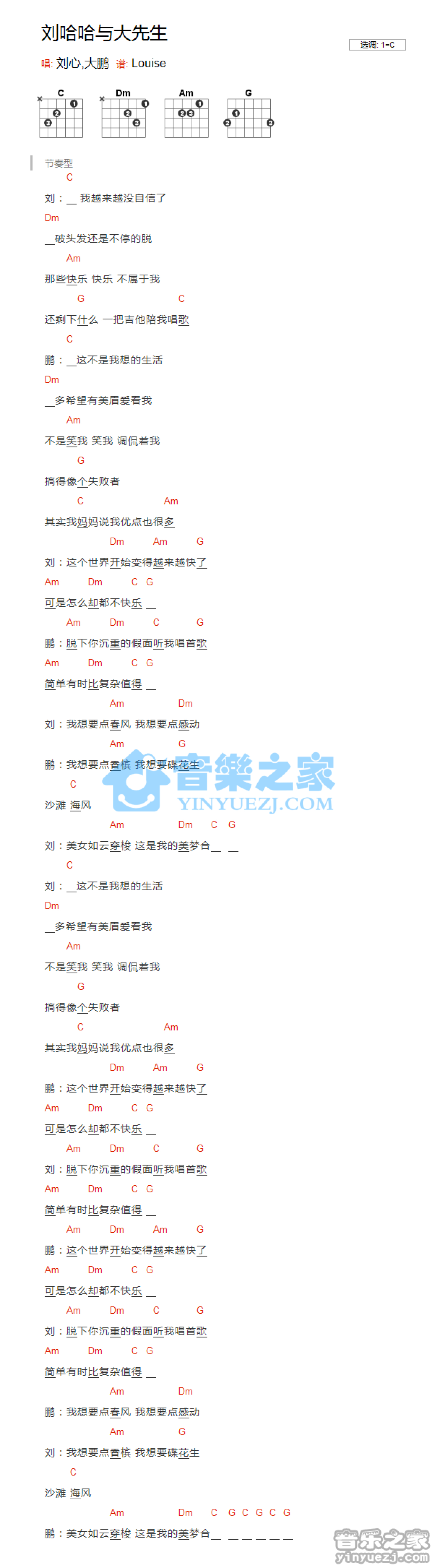 刘哈哈与大先生吉他谱 - 刘心/大鹏 - C调吉他弹唱谱 - 和弦谱