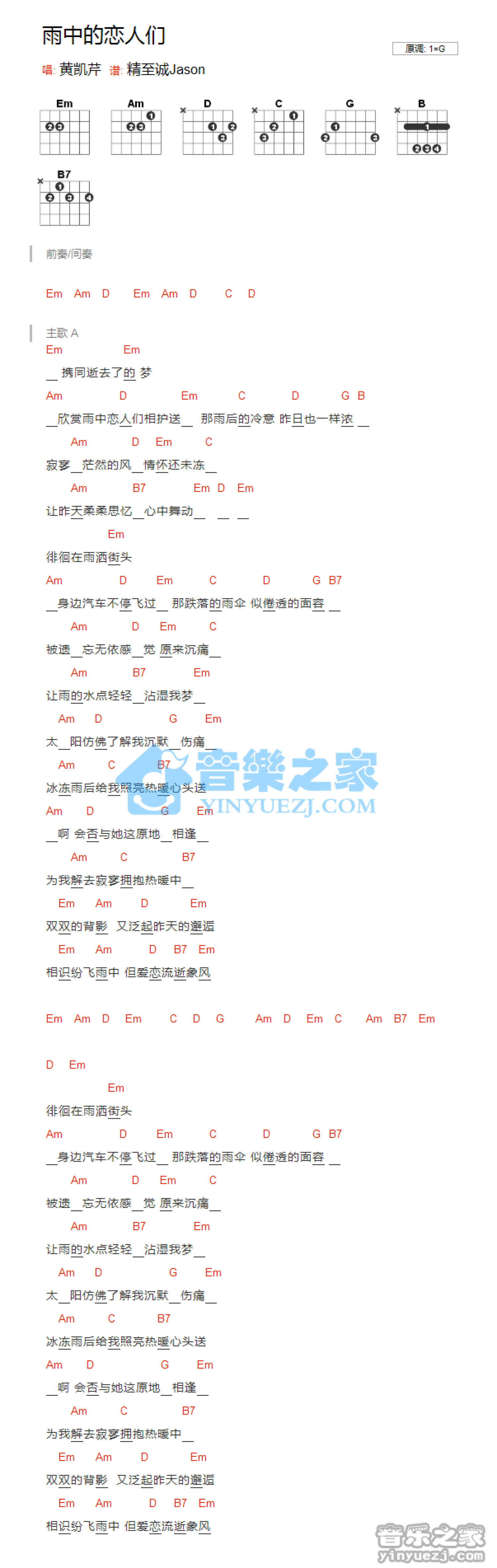 曲谱介绍: G调版《雨中的恋人们》吉他和弦弹唱谱