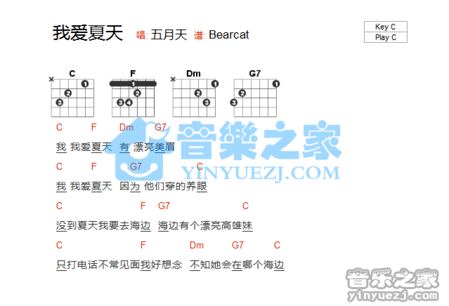 曲谱介绍: C调版《我爱夏天》吉他和弦弹唱谱
