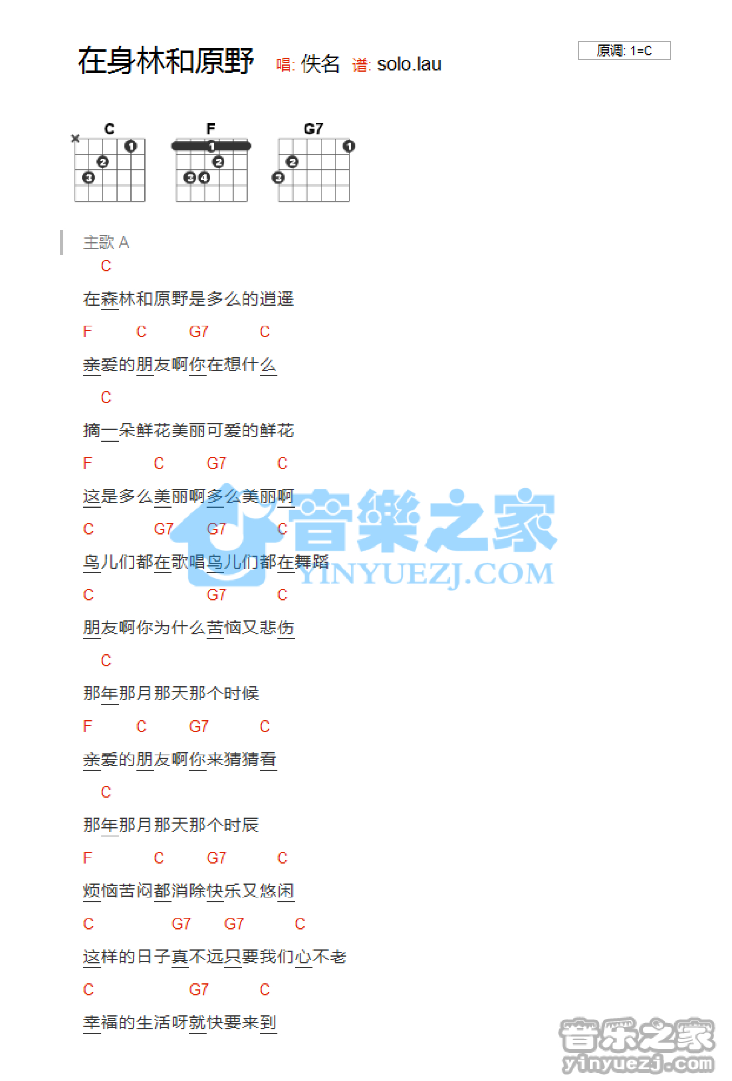 曲谱介绍: C调版《在森林和原野》吉他和弦弹唱谱